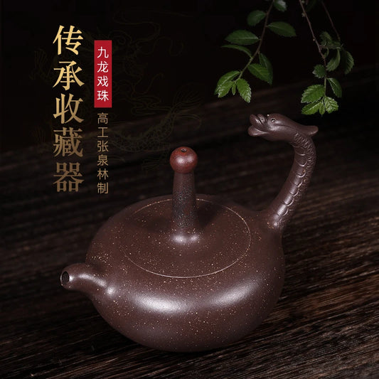 |Yixing purple clay pot famous pure handmade raw ore Purple mud double dragon playing with beads Kung Fu tea pot tea set