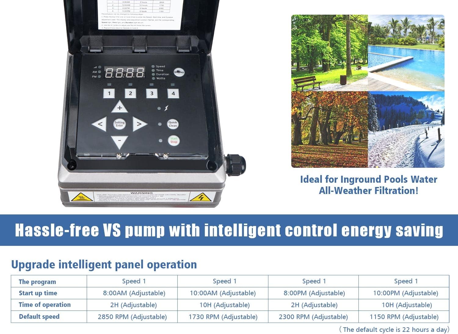 1.5HP Variable Speed Inground Pool Pump 230V High Performance Intelligent Control for Swimming Pools All-Weather Water Clean Filter Pump System Replacement ETL/DOE Certificated, CSPPV711