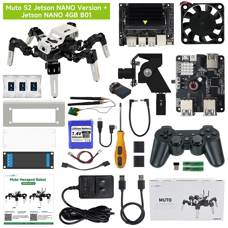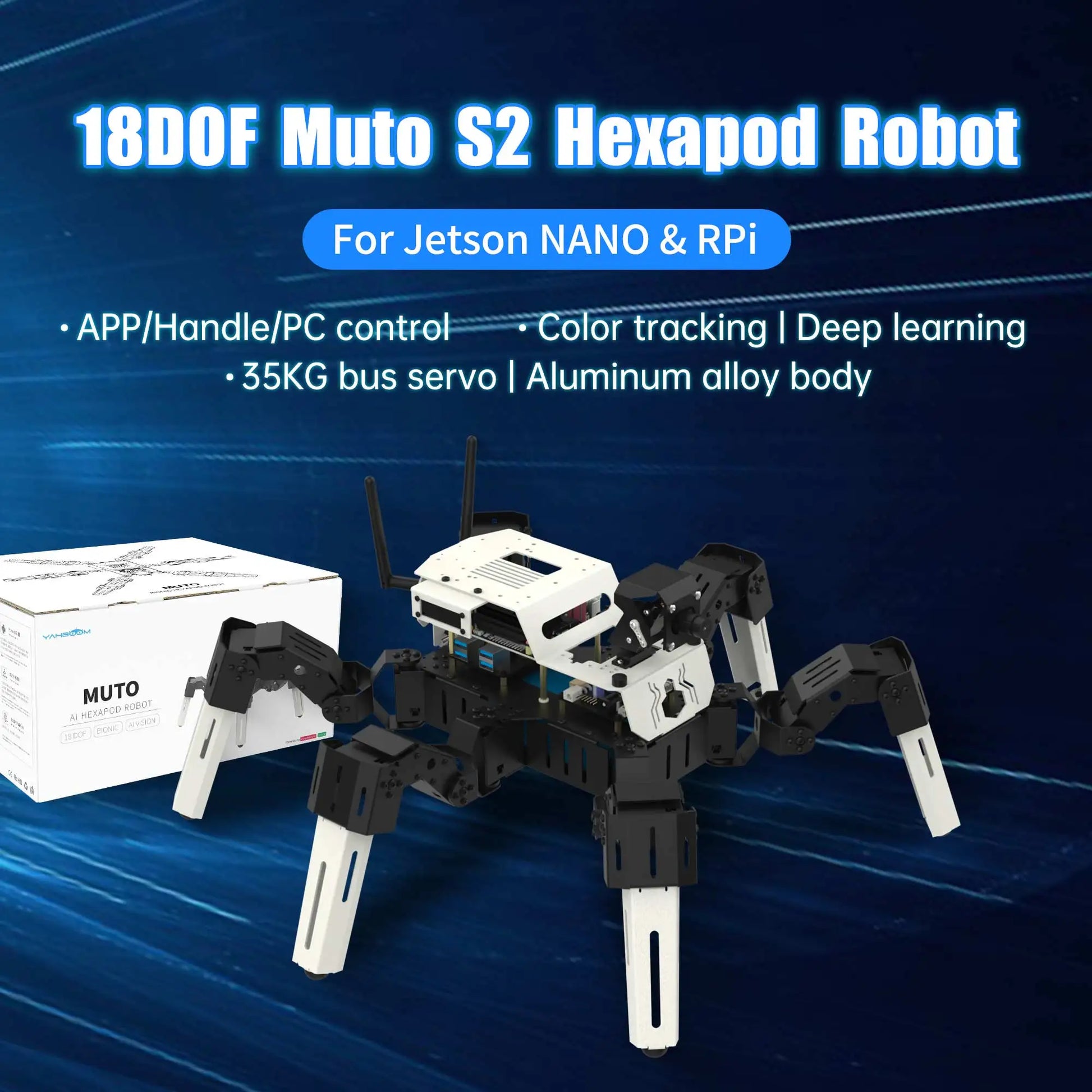 Muto is a desktop-level bionic hexapod robot with aluminum alloy body. 18PCS 35KG metal servos and exquisite structural design enable it to perform various simulation actions with amazing flexibility and diversity. With the help of Raspberry Pi or Jetson Nano as the main controller and Python3 programming, Muto can complete various functions such as color recognition, following, face tracking, QR code recognition, and visual line patrol. User can control it by mobile APP, wireless controller and computer web page button, can transmit the video captured by the camera to the mobile phone in real time. Muto robot is an ideal companion for exploring technology, engineering and programming.