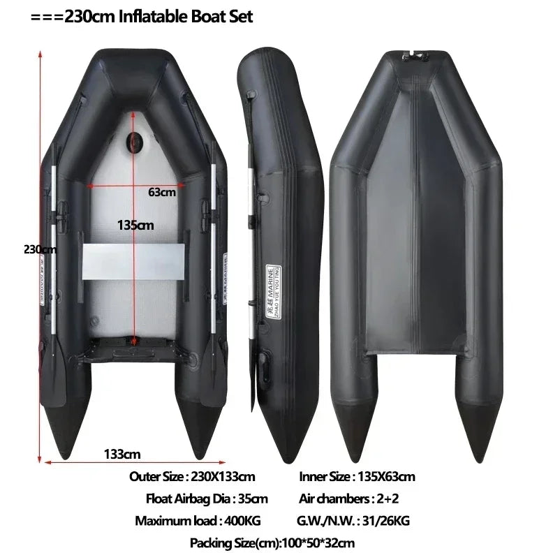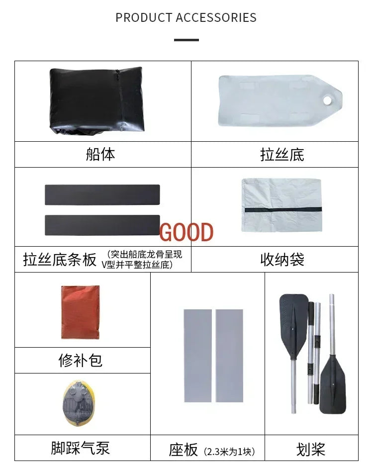 ●Set Included: Boat Hull, Air deck x 1, Alloy oars x 1 pair,Boat carry bag x 1,Foot air pump x 1,Repair kit x 1