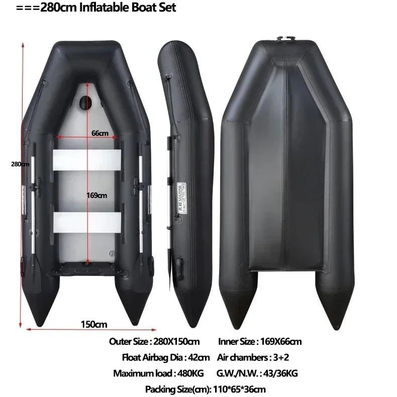 ●Deep V-keel with rub-strake protection for easy planing . Five individual chambers, one-way drain valve with plug, built-in oarlock for easy rowing, aluminum side joiners with rubber ends, Stainless steel D-rings for easy towing.