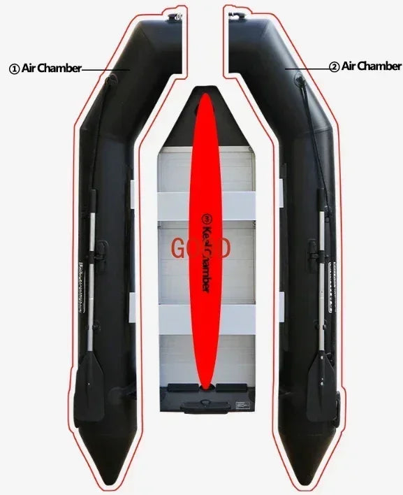 ●Deep V-keel with rub-strake protection for easy planing . one-way drain valve with plug, built-in oarlock for easy rowing, aluminum side joiners with rubber ends, Stainless steel D-rings for easy towing.