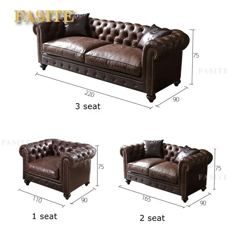 High Quality Leather Sofa Vintage Style Roll Arm Chesterfield Sofa