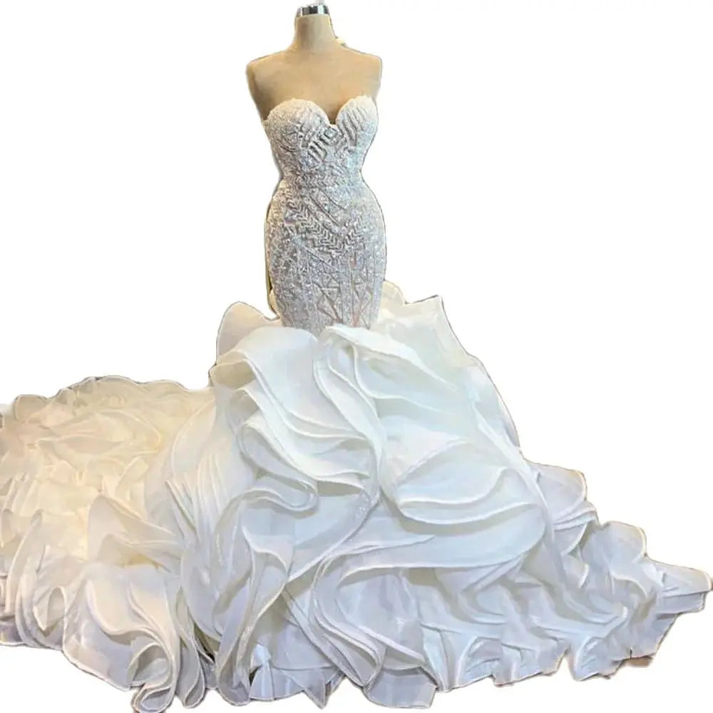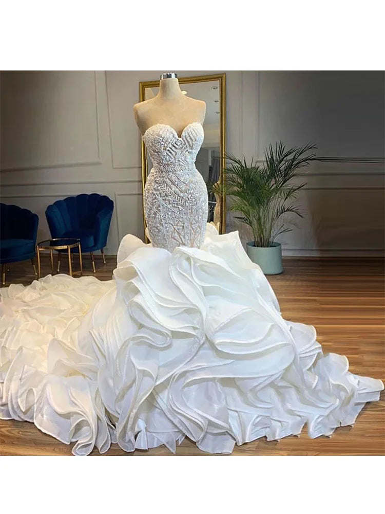 Women Luxury Beaded Bridal Mermaid Wedding Dress Floral Ruffles Sparkly Illusion