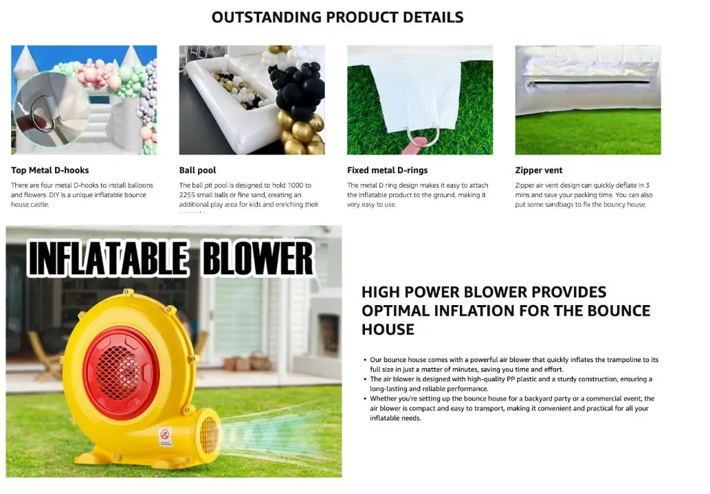 Accessories:Blower(110V-220V with matched voltage and plug accordingly),ropes,sandbags,repair kit