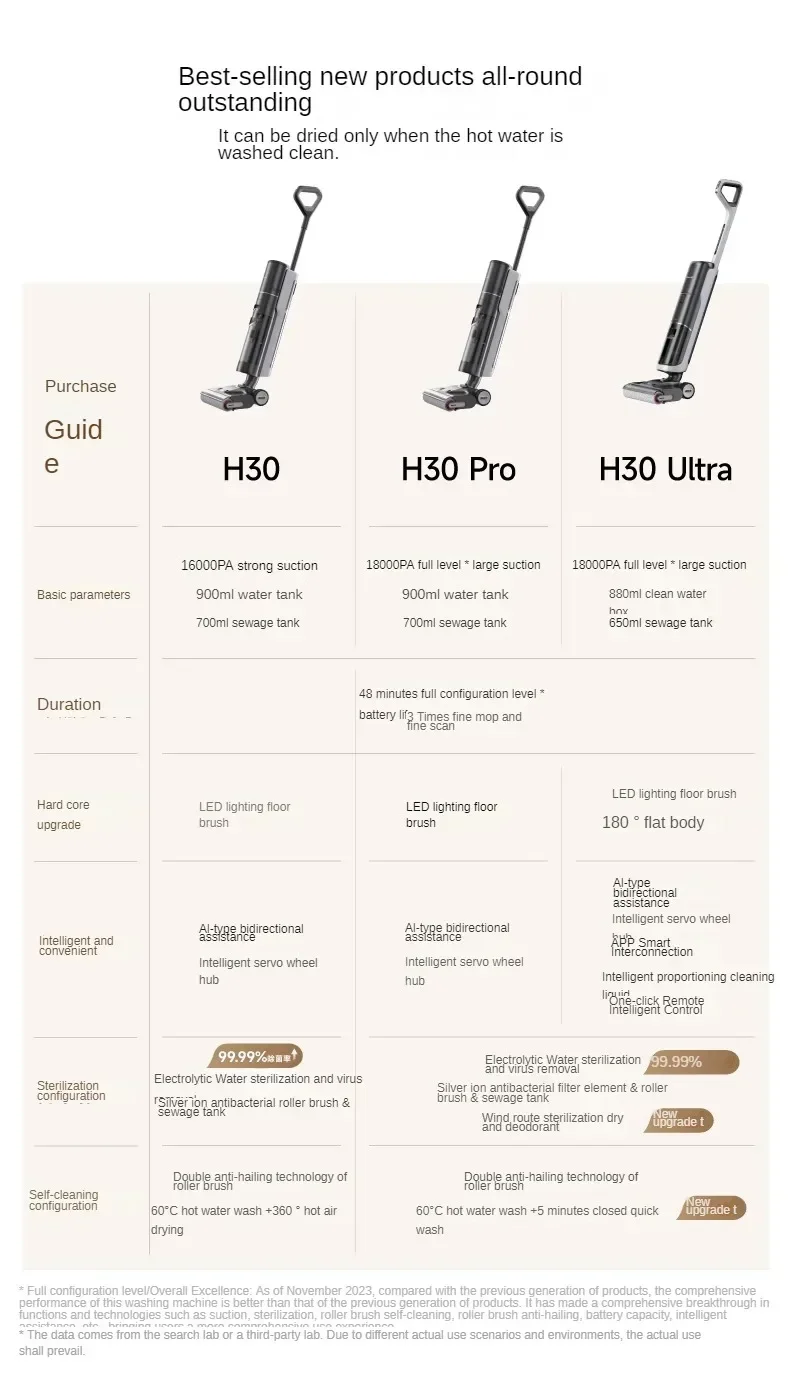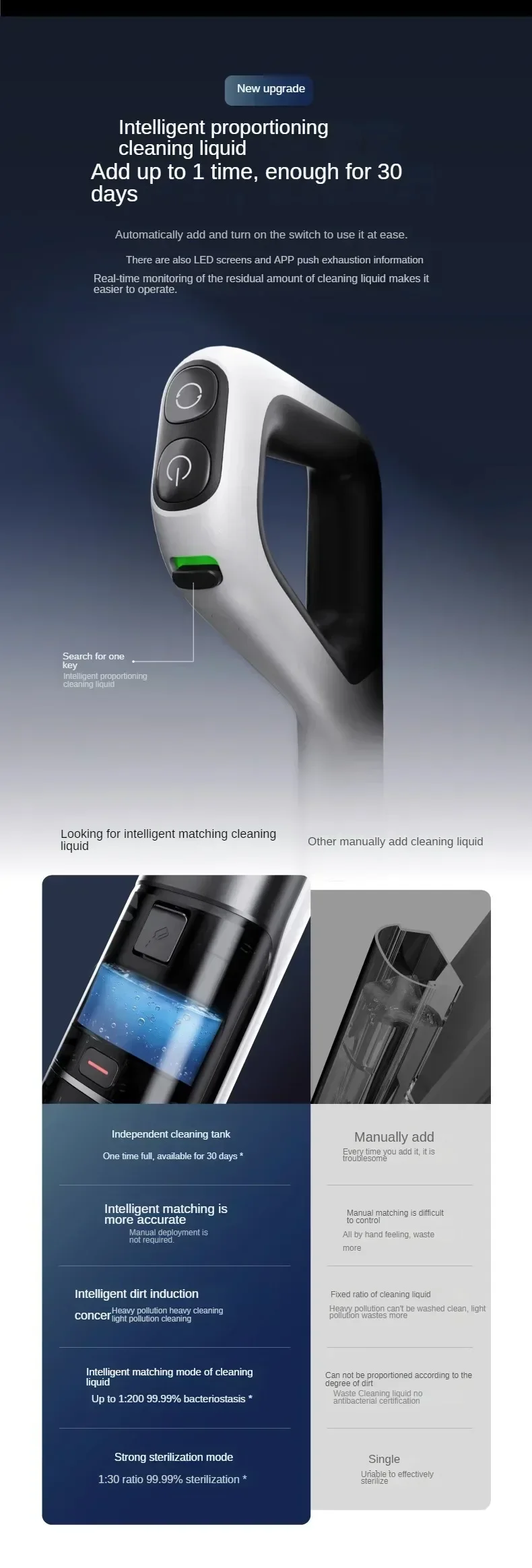 Weight : 3-6 kg Battery Type : Li-ion Battery Life : 30-59 min LCD : Yes Cleaning Route : Random Type Cord Length (m) : Wireless Timing Reservation : No Remote Control : No Installation : Hand Held Voltage (V) : 100-240V Power (W) : 350W Function : Mopping & Sweeping & Suction Type Brand Name : Esyhey Origin : Mainland China model : H30 Ultra Color classification : H30 Ultra/full chain sterilization, new upgrade, intelligent interconn Additional features : High temperature full chain quick-drying, drying, sterilization, light power : 350W Maximum noise : 76dB rotate speed : 69,000 rpm Body weight (including battery) : 5.7kg Battery life : 48min Is it intelligent : be Type of floor scrubber : Single roll brush Maximum suction power : 20AW Sewage tank capacity : 650 milliliters