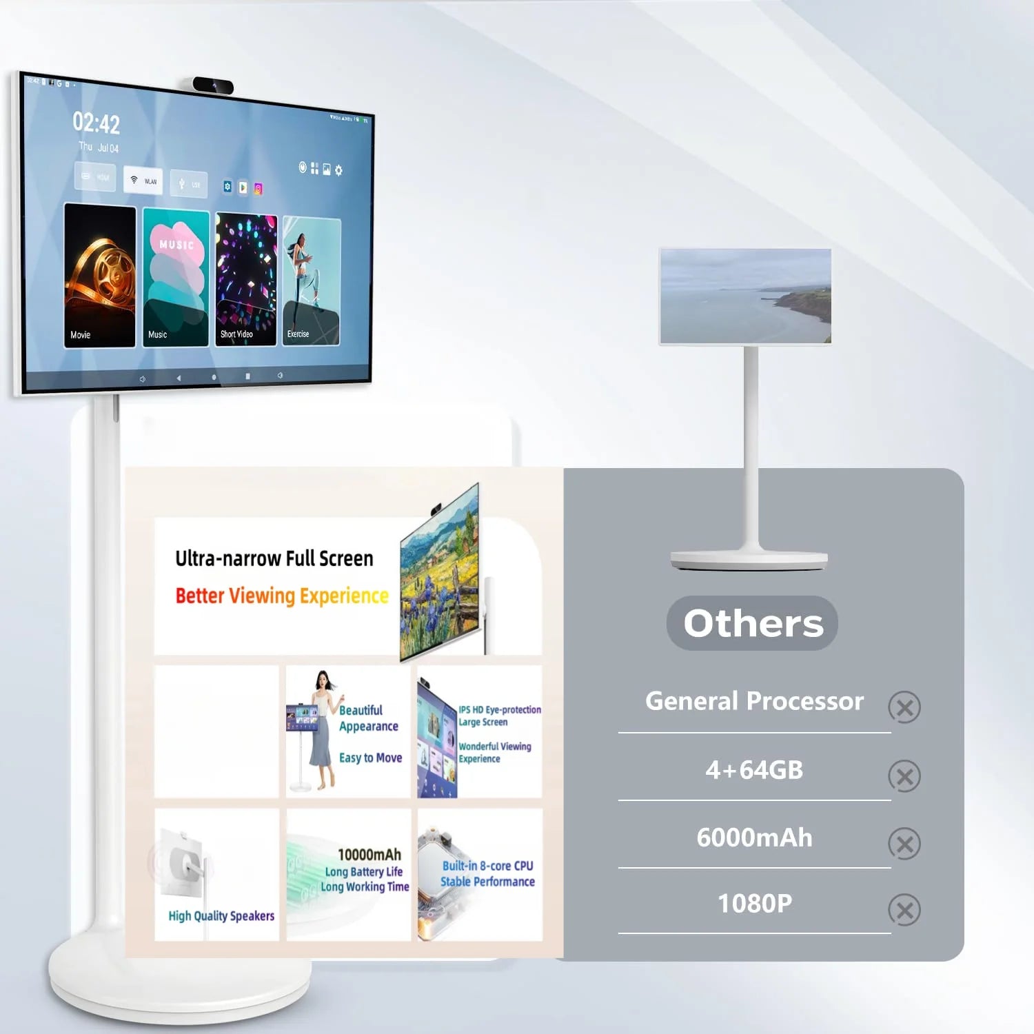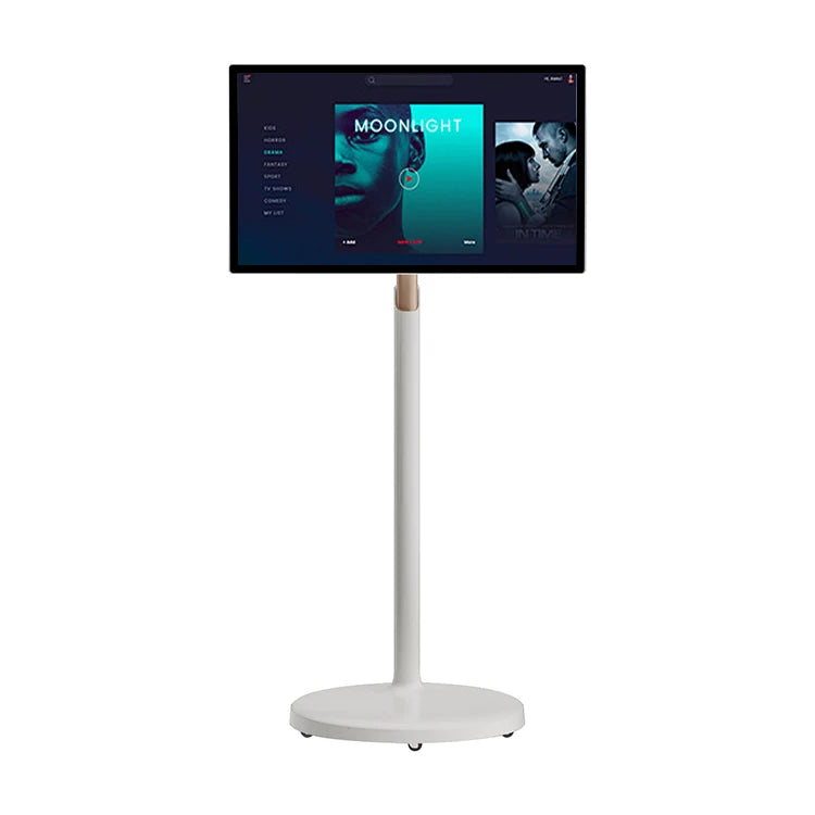 Screen angle adjustment and base roller Screen on the wheels can be adjusted 90° to the left and right at any time, as well as ±20° bevel angle adjustment, enabling the monitor to offer you a more precise and comfortable angle. The bottom of the base is equipped with 5 silent rollers, allowing this large Android tablet to be moved easily and quietly to the living room, kitchen, bedroom, etc.