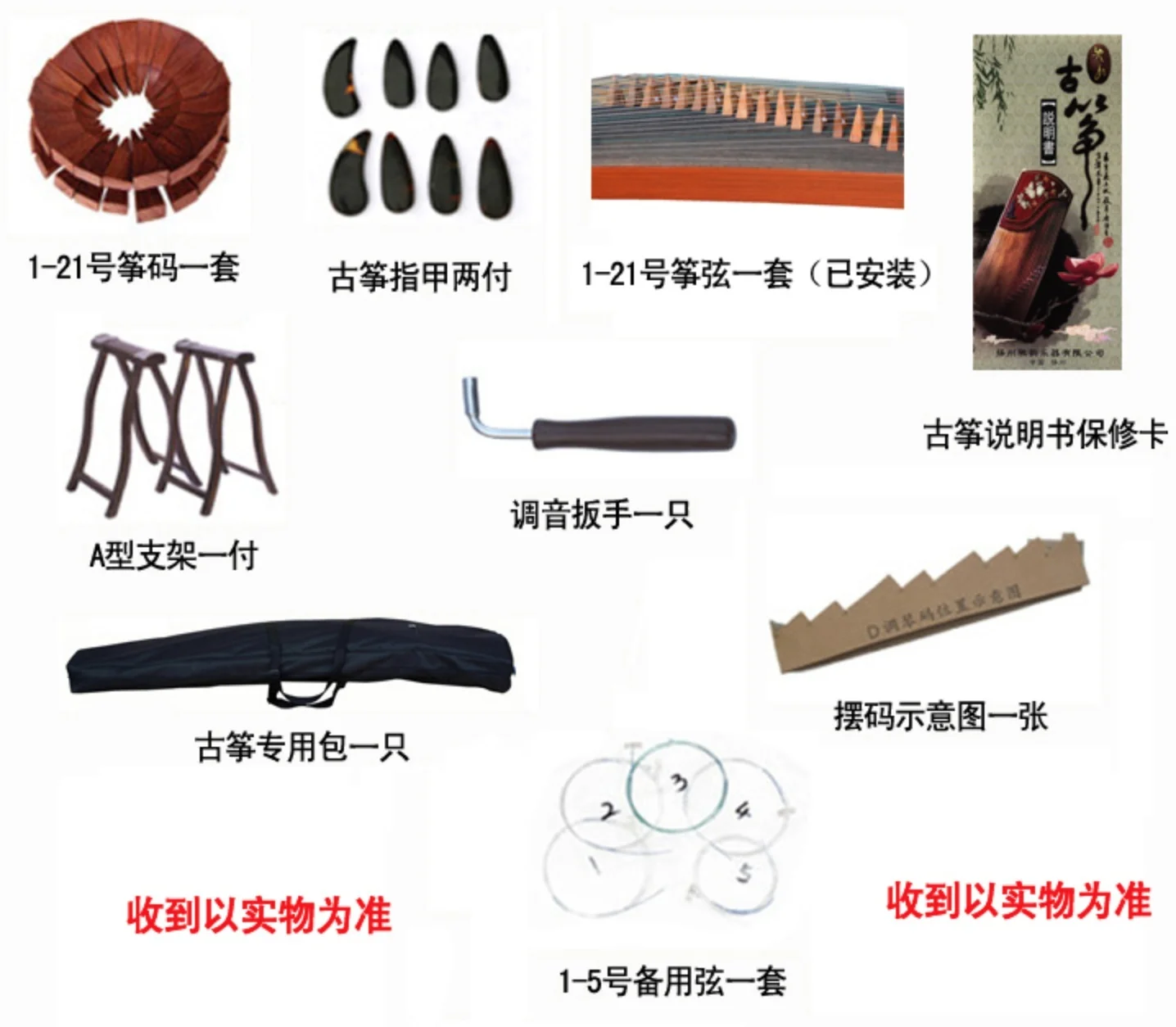 Accessories: tuning wrench, a special piano bag, a manual, 2 sets of nails (8), a set of strings (installed), a set of strings, a pair of guzheng A-type brackets, spare strings 1-5 , A copy of the piano code placement control chart.