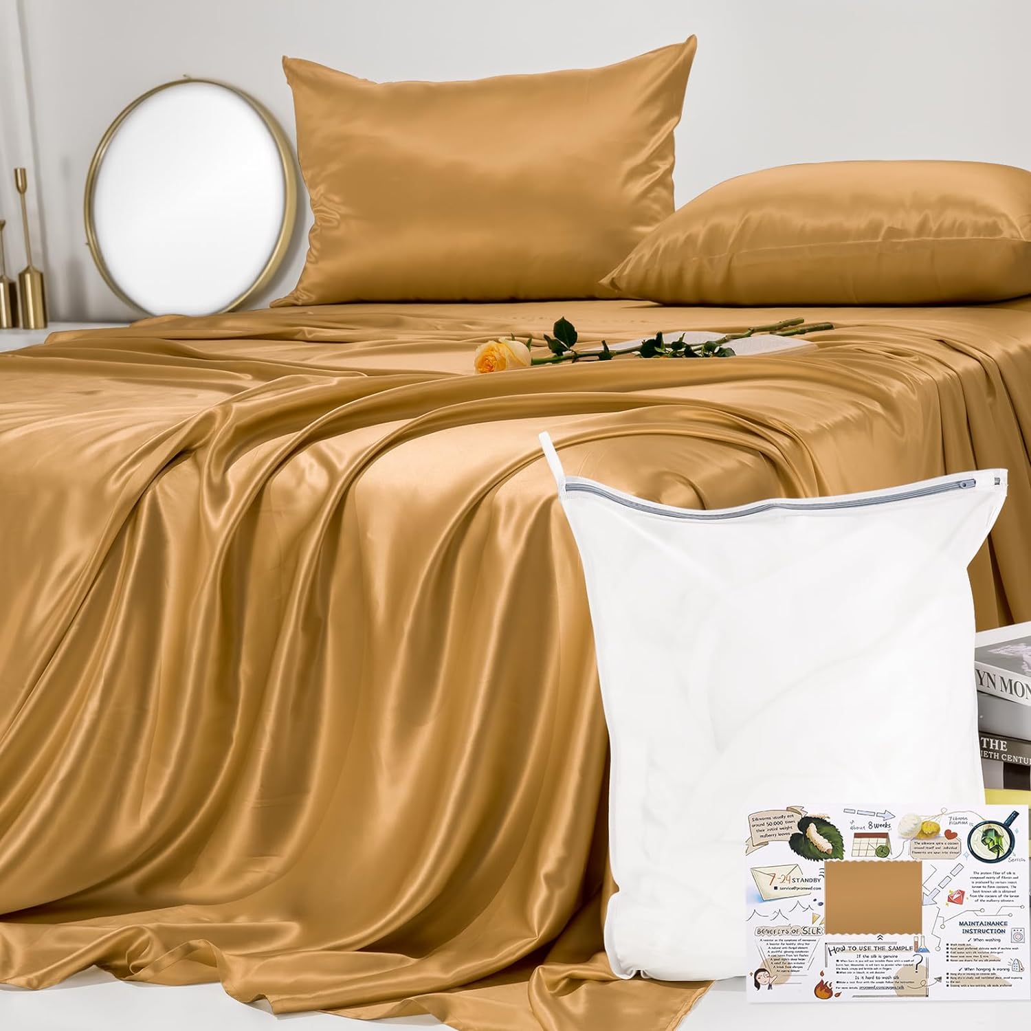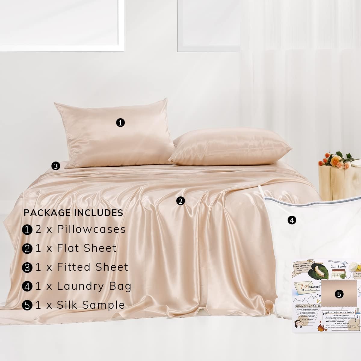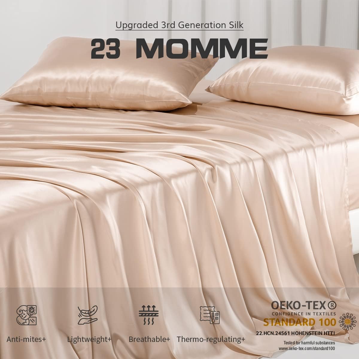 23 Momme California King Silk Sheets Set 4 Pieces, Includes Flat Sheet, Fitted Sheet and 2pcs Pillowcases, 4pcs Mulberry Silk Sheet Set for Cal King Bed (Champagne, California King)