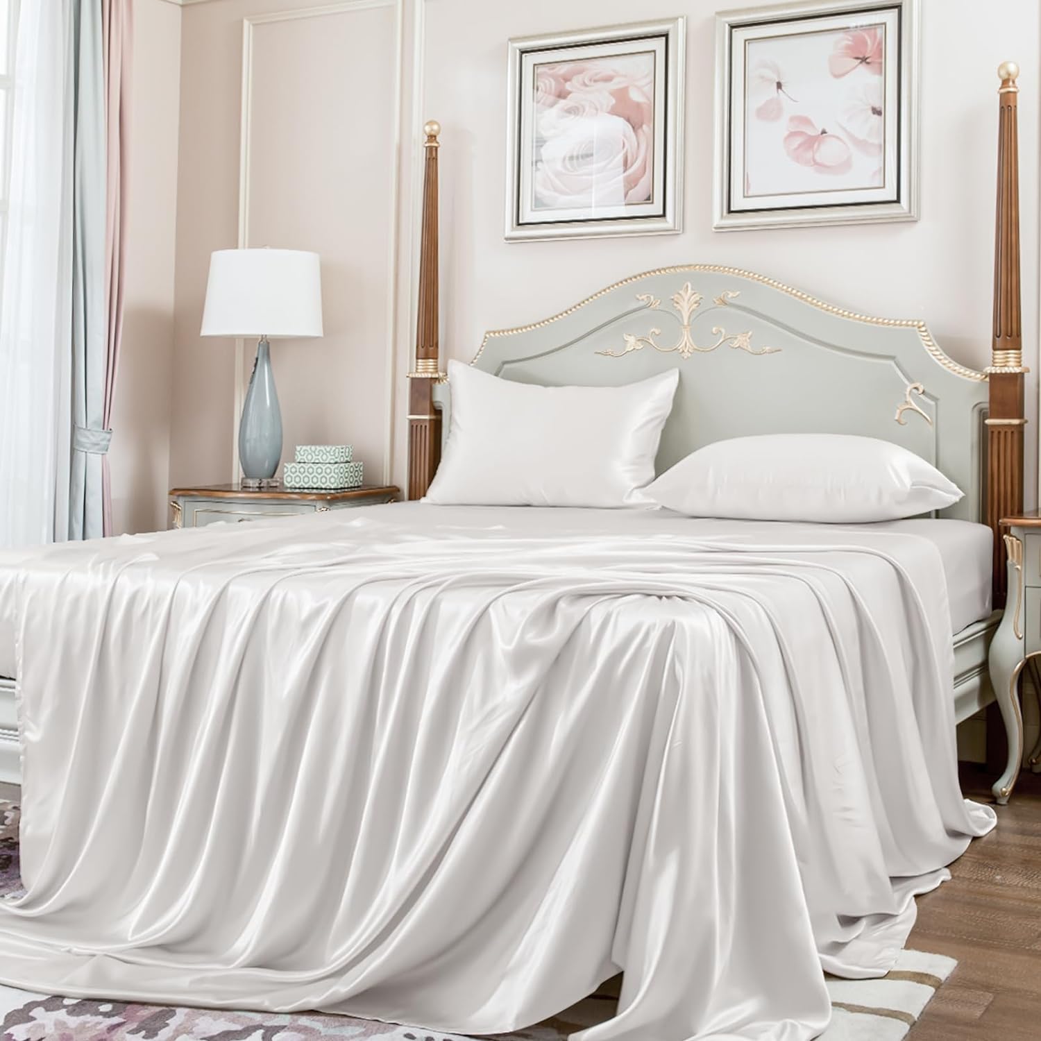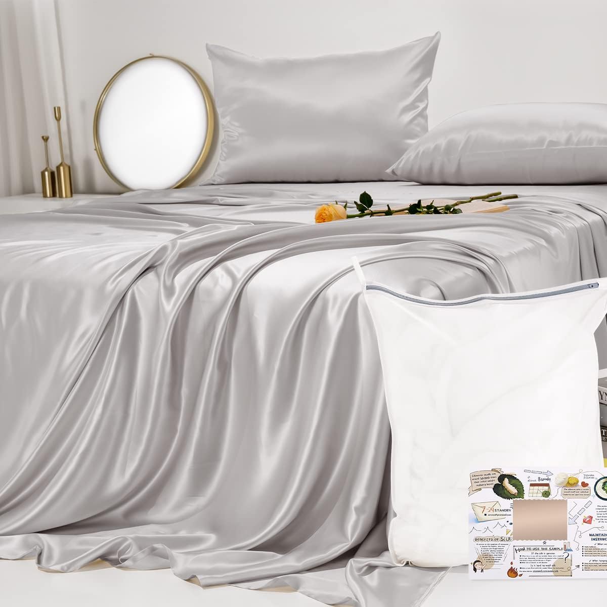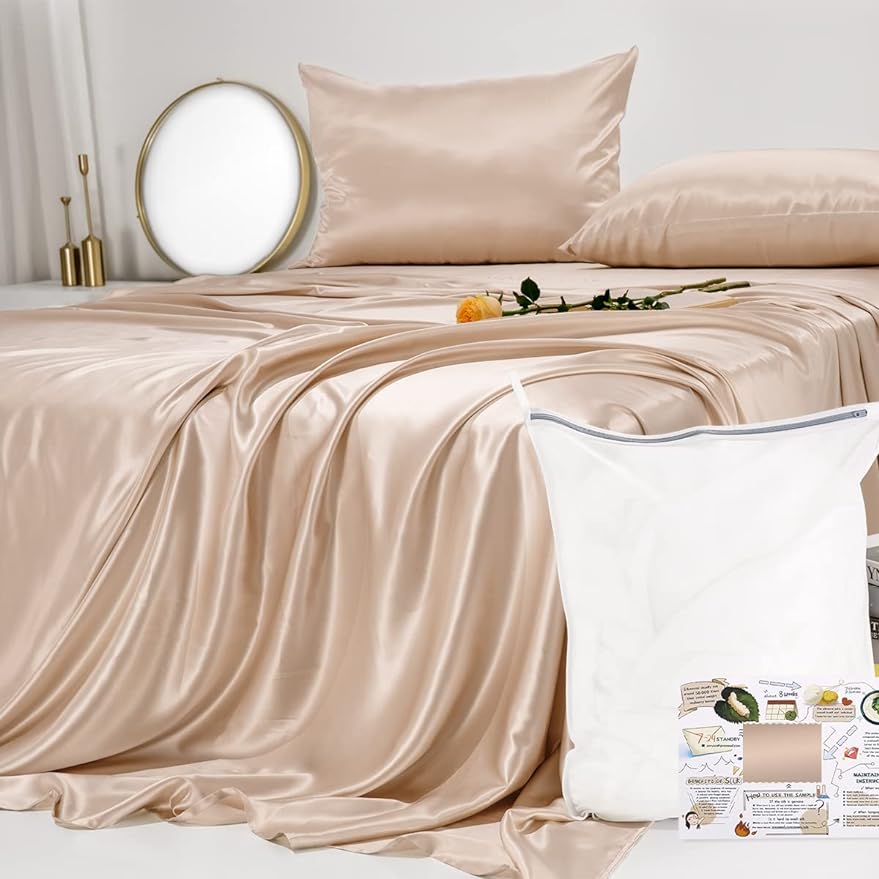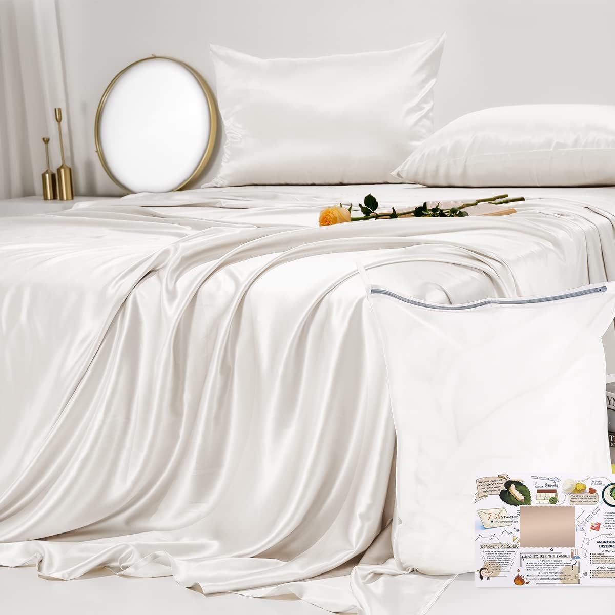 23 Momme California King Silk Sheets Set 4 Pieces, Includes Flat Sheet, Fitted Sheet and 2pcs Pillowcases, 4pcs Mulberry Silk Sheet Set for Cal King Bed (Champagne, California King)