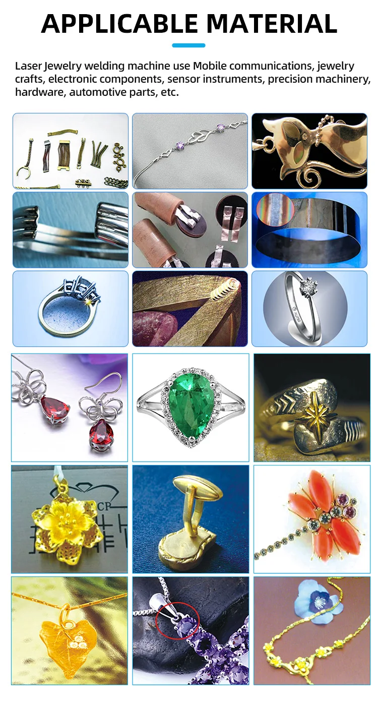 Jewelry laser welding machine suit all kinds of metal materials such as Gold Silver Platinum ,Copper Titanium Stainless steel etc. and jewelry such as ring ,earring bracelet,necklace ,tie bar cuff-link ,as well as metal decorations