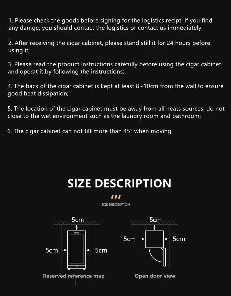 1.Quality: the cigar cabinet is made by a very good factory in China, it comes with good quality, really match the cost. Please refer to the real pictures which taken before packaging.