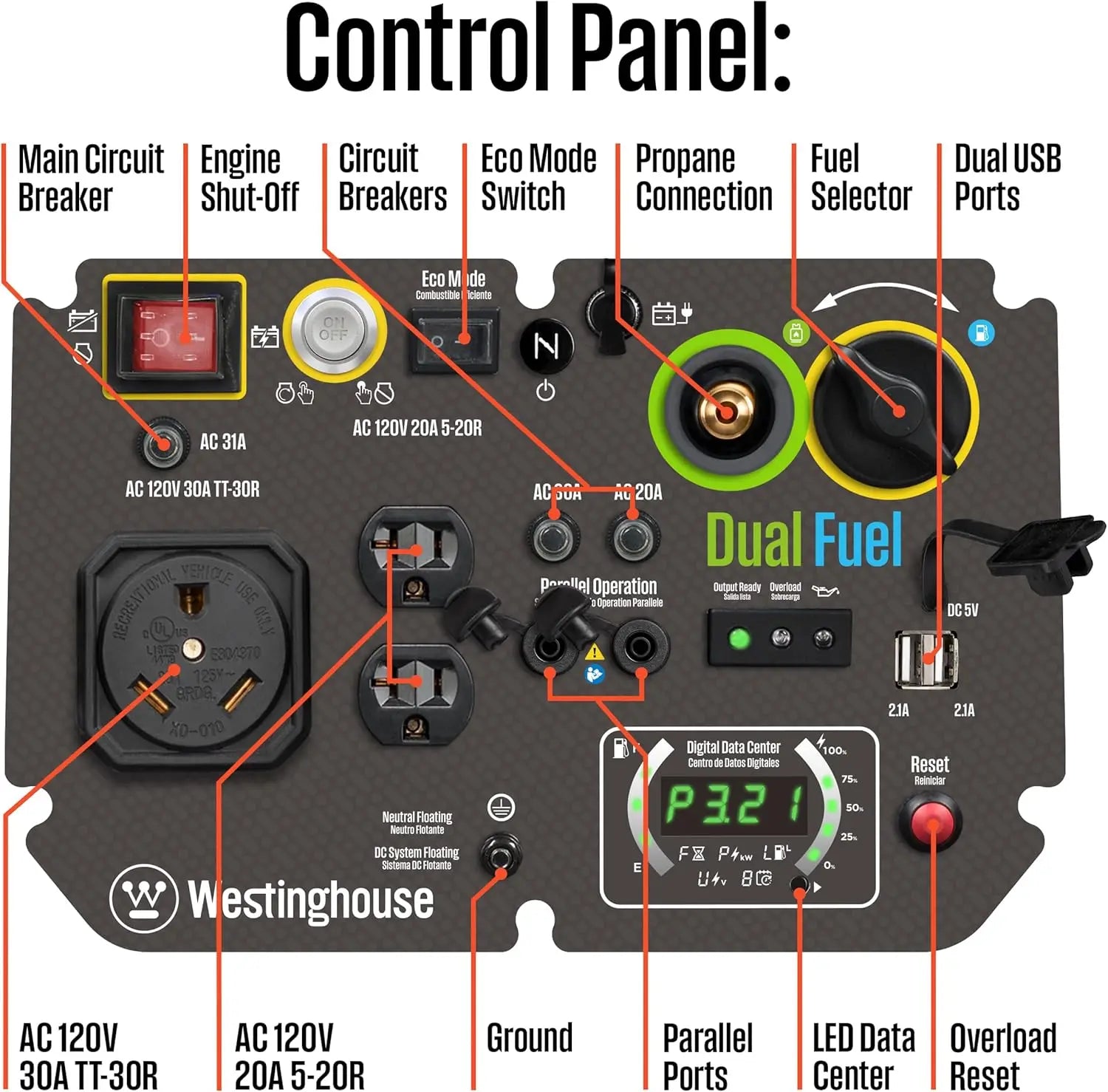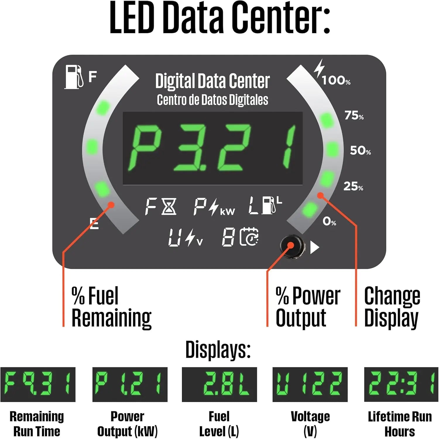 - Led Data Center: Rotating Digital Display Shows Fuel Level, Power Output, Remaining Run Time, Voltage Output, and Lifetime Hours