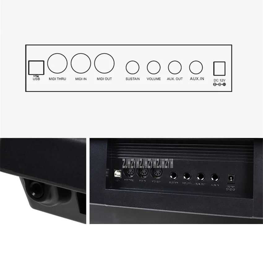 auxiliary output interface, tenuto pedal interface, volume pedal, USB-MIDI port,