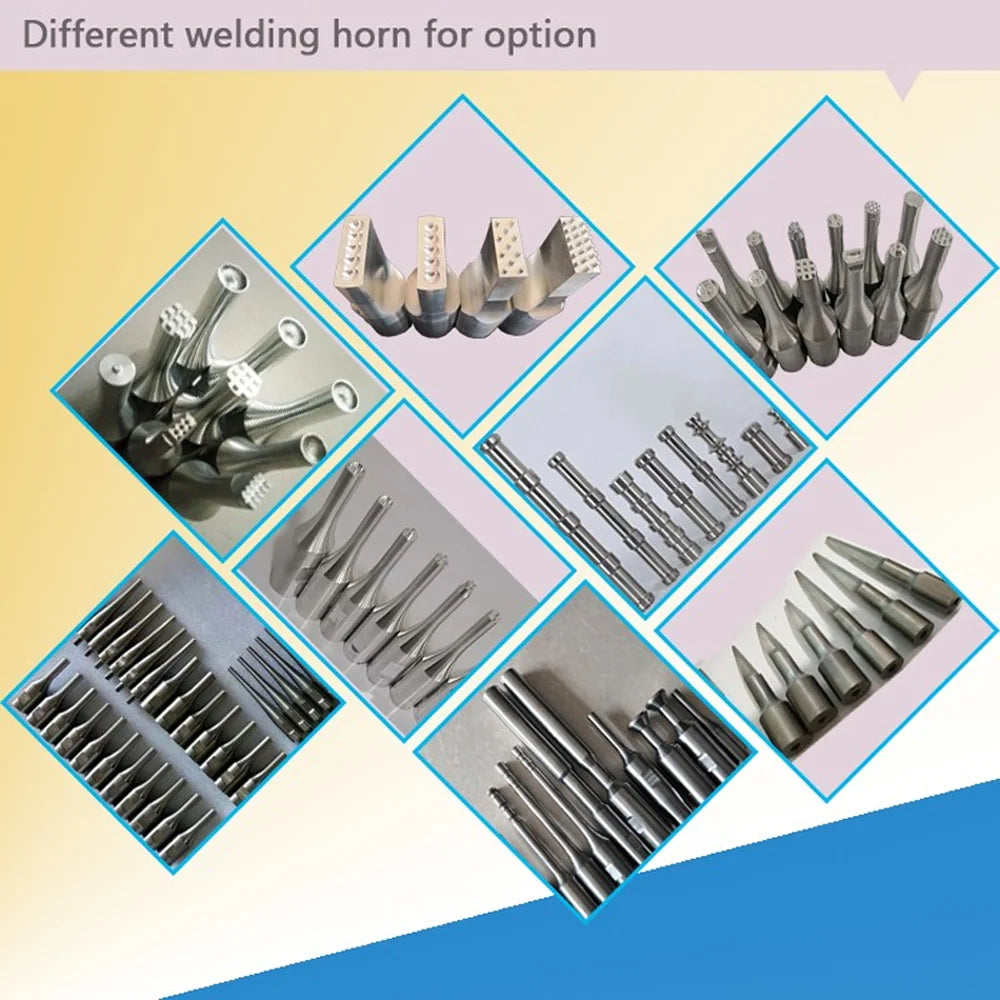 The power supply of this machine can be either 220V or 110V, with a power of 1200W, and the power can be adjusted. The welding time can be adjusted, and the handle has a straight handle and a gun type handle to choose from. The frequency is conventional at 28kHz, and there are also options of 30kHz or 35kHz at 40kHz. The ultrasonic mold can be customized according to the product you choose, or you can choose the conventional mold from numbers 1-21.