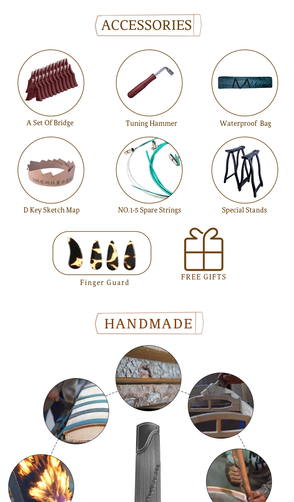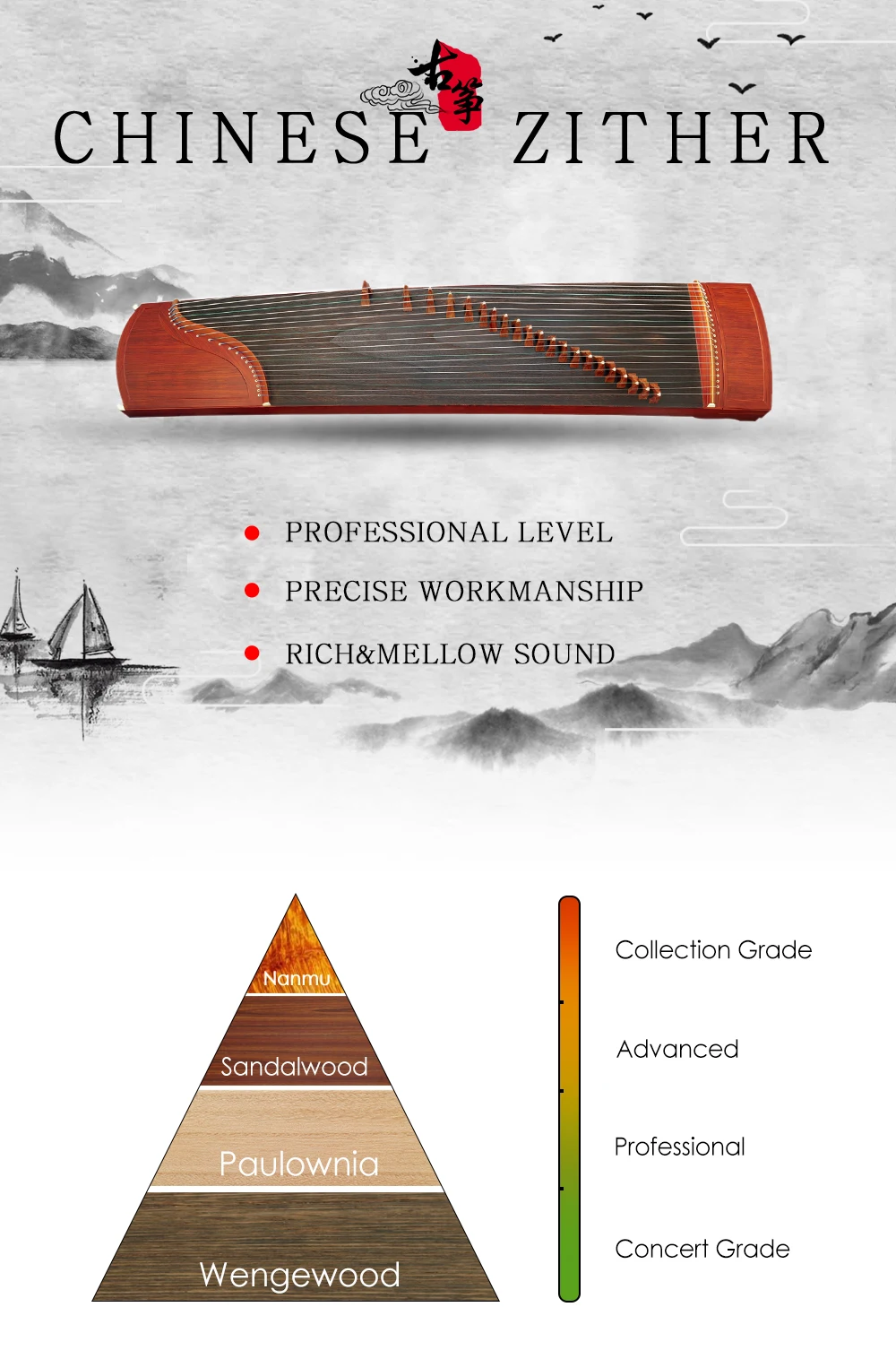 This guzheng adopts rosy sandalwood, paulownia wood, pine wood and solid wood as the main material. All the material used were of good quality and were soaked, slag removed and dried before using, which directly contribute to the smooth touch feeling and good sound of the guzheng. The carved Chinese characters were handcrafted by professional cutlers with precise workmanship, making the guzheng exquisite and elegant as well as giving the guzheng culture connotation. The strings were covered by nylon to make the sound rich, mellow and vibrant.