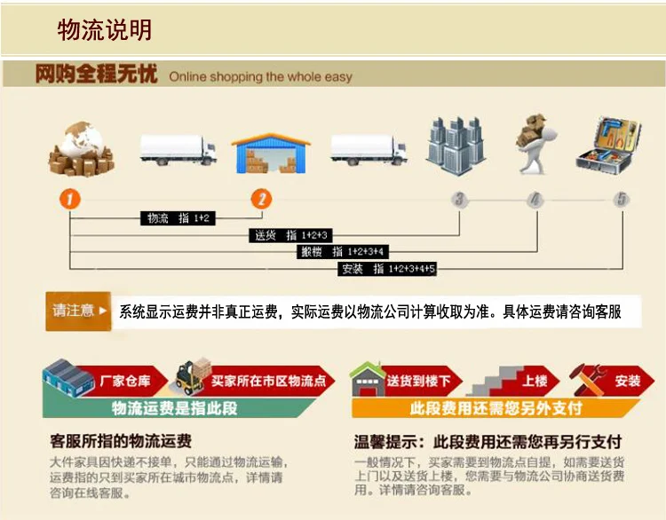Freight description: there is an error in the freight in the "delivery and installation" column. For more detailed freight amount, please consult customer service to estimate it for you. The goods are delivered home by logistics, the buyer directly pays the freight to the logistics company when the goods arrive..