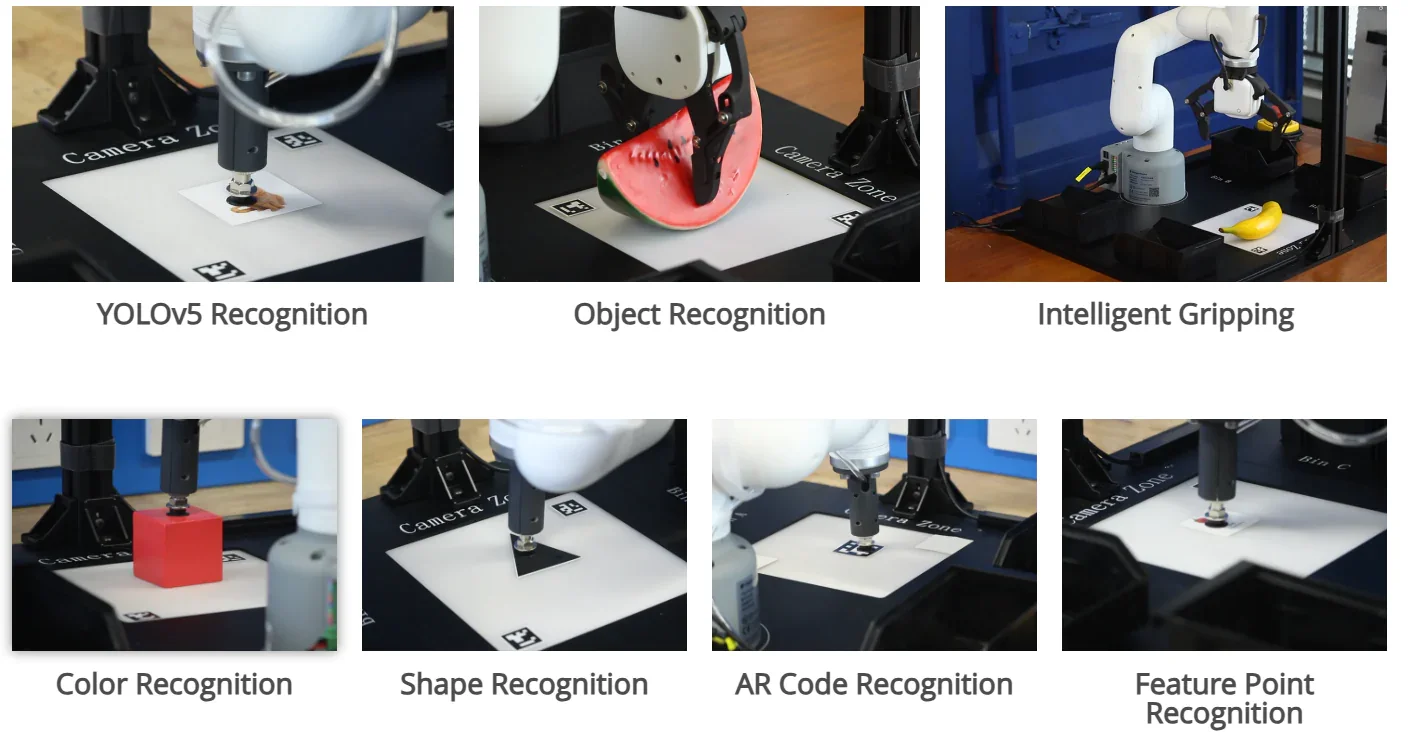 AI kit has 5 built-in main visual recognition algorithms and users can use different colored wooden blocks and different shaped cards for the recognition function. Also, users can use 4 types of QR CODE recognition to learn the relationship between 2D and 3D. Feature point recognition helps users learn to understand image segmentation and features and learn YOLOv5 algorithm quickly.