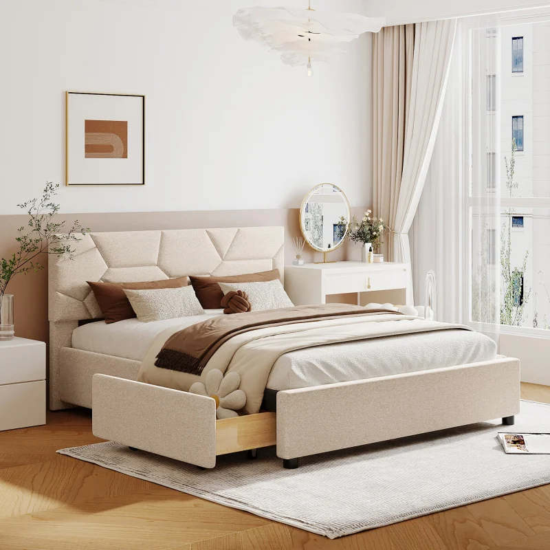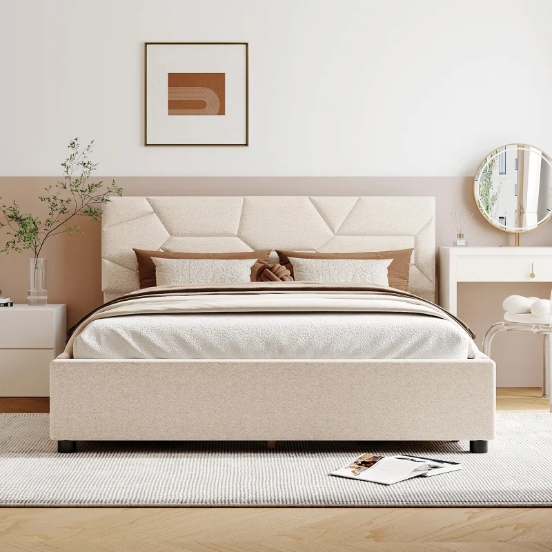 MMOOKA Beige Queen Size Upholstered Platform Bed with Brick Pattern Heardboard and 4 Drawers, Linen Fabric,for indoor bedroom furniture