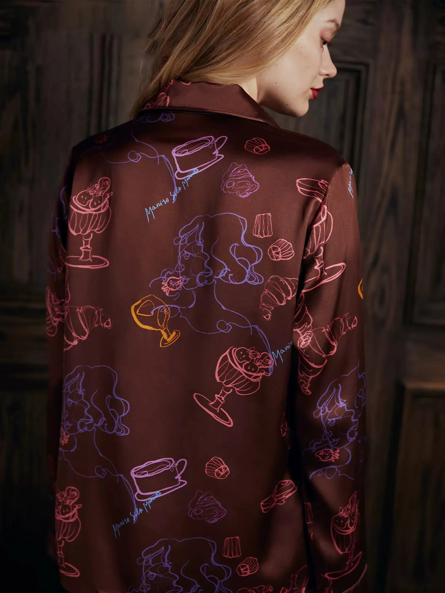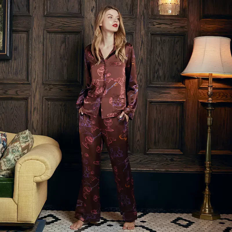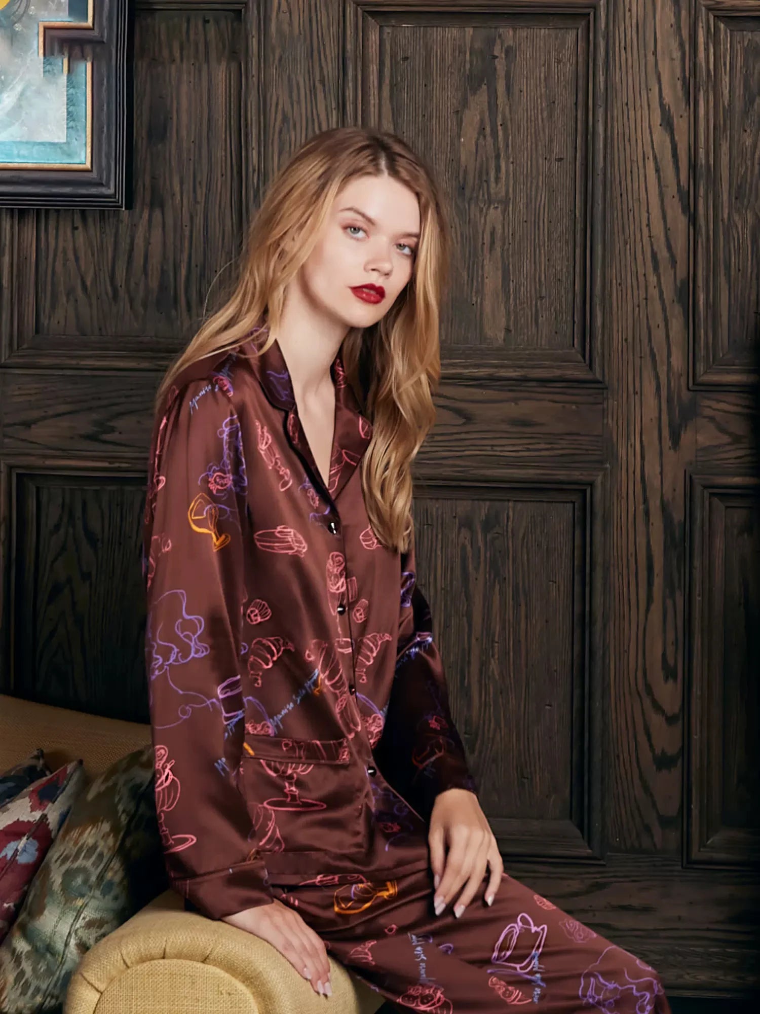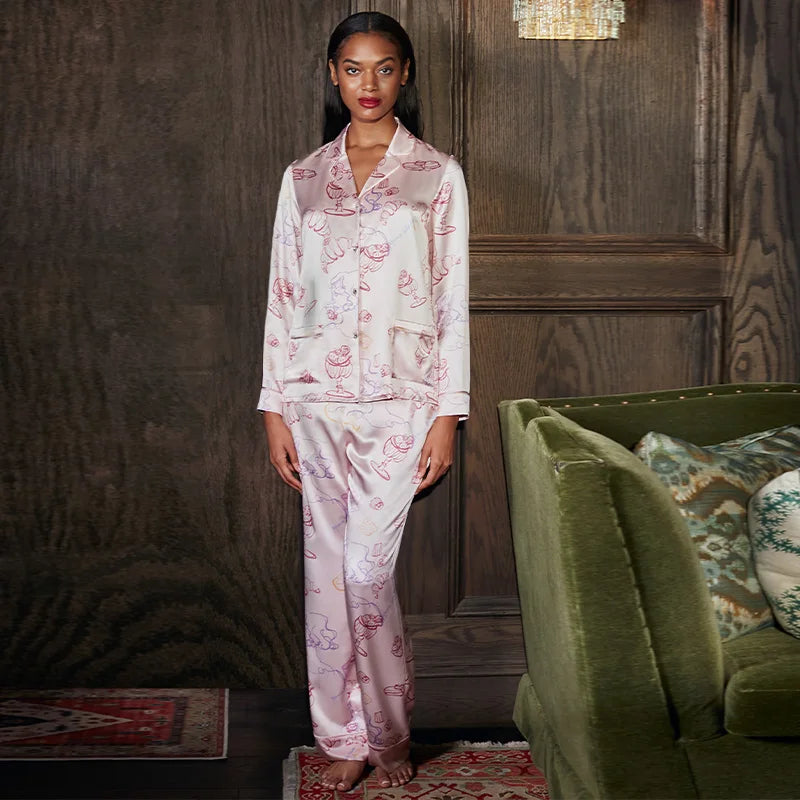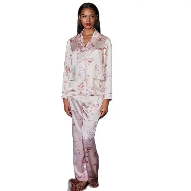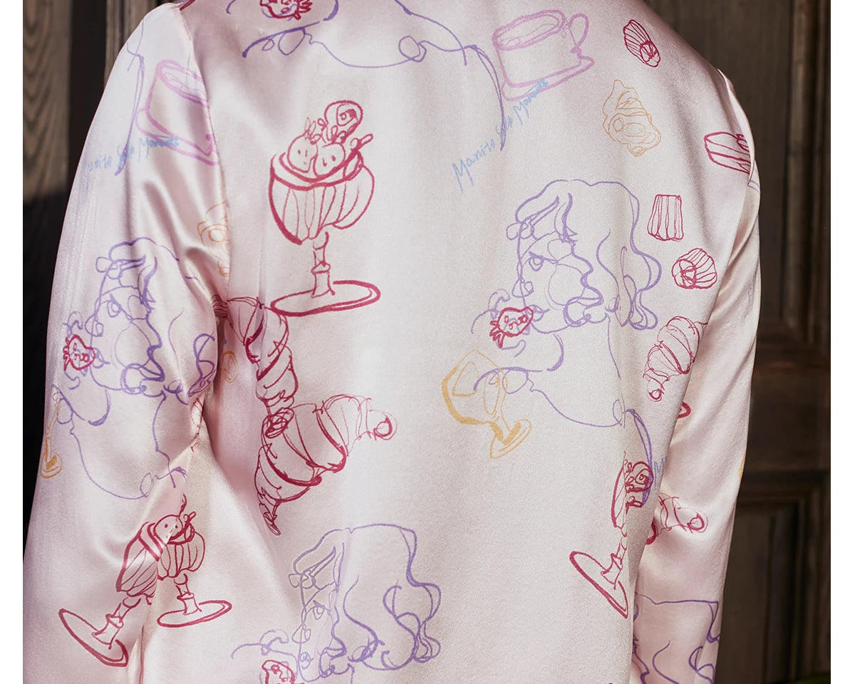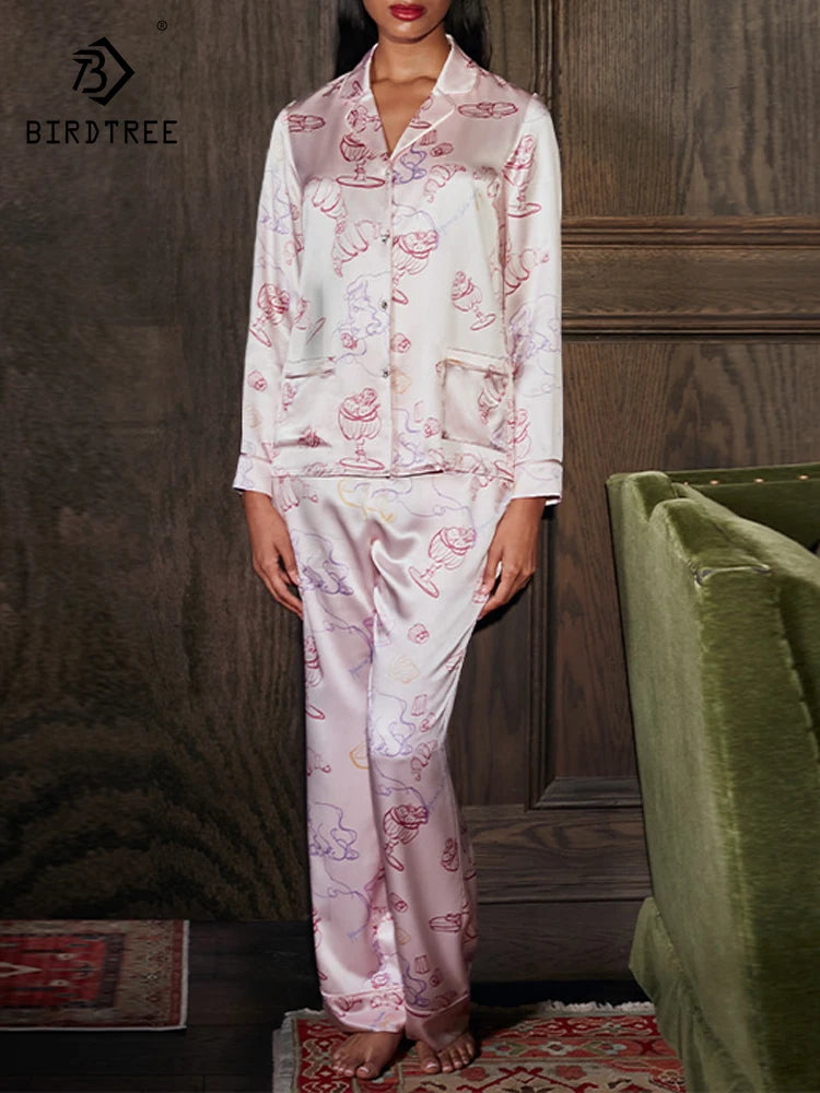 BirdTree, 22MM 100%Mulberry Silk Casual Pajamas Set, Women Long Sleeve Top Pants, Print Home Clothing Set, Summer Fall S48840QC