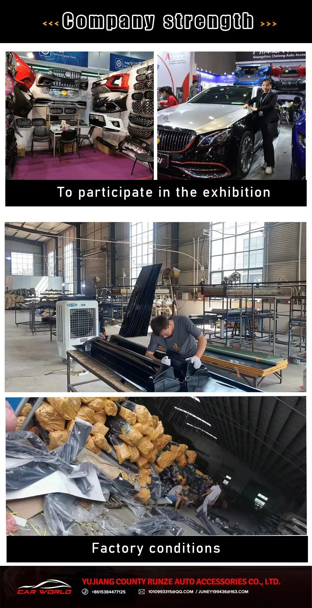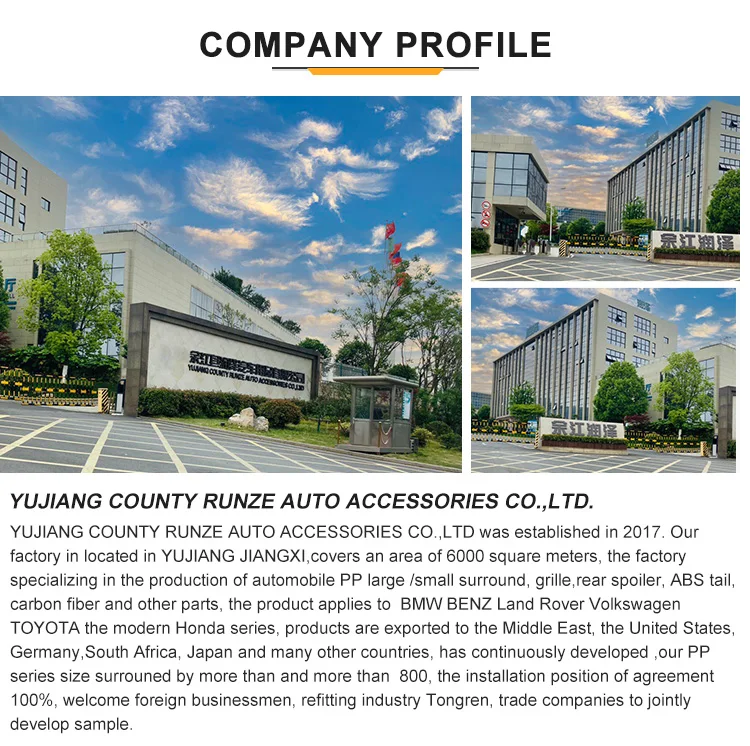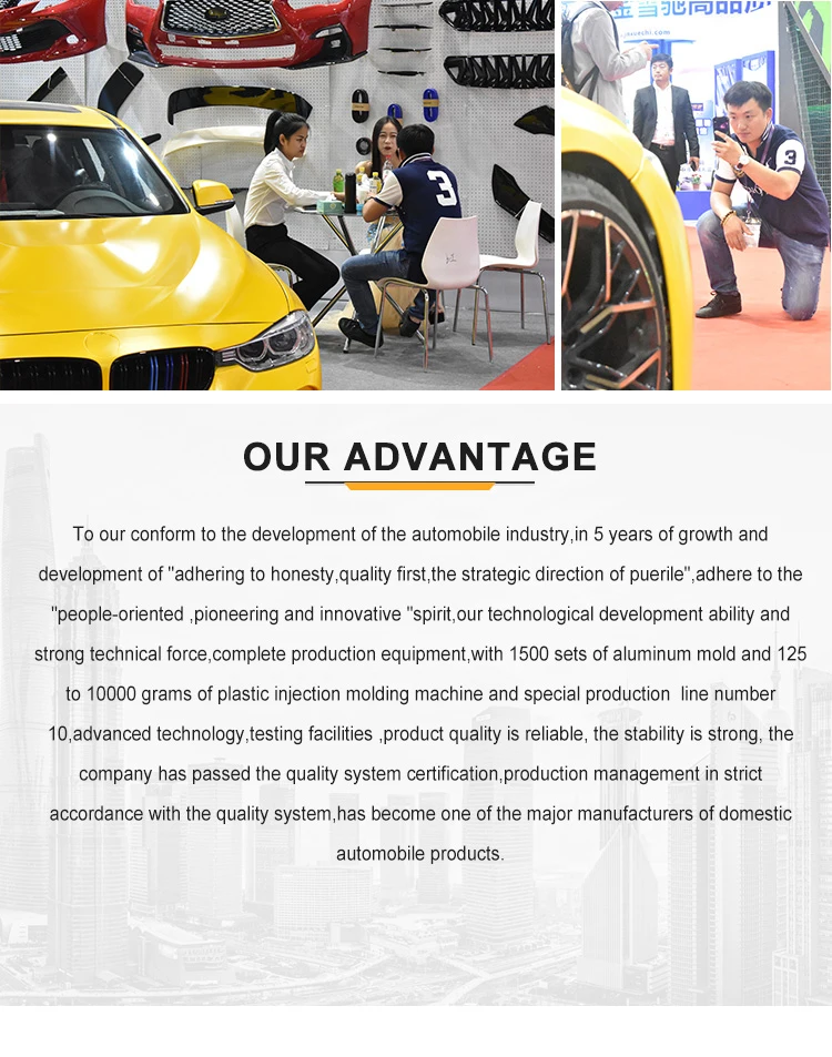 Our company was established in 2017, is located in yingtan city, jiangxi province, the factory covers an area of 7500 square meters, has the advanced package car research and development technology and professional production equipment, to become a car modification industry one of the major manufacturers, the company existing more than 100 people of design, production and sales team, our company's main plastic material such as PP, ABS, carbon fiber car parts, can be in accordance with the requirements customize their own body kit, provide customers from design, development, production to after-sales service,