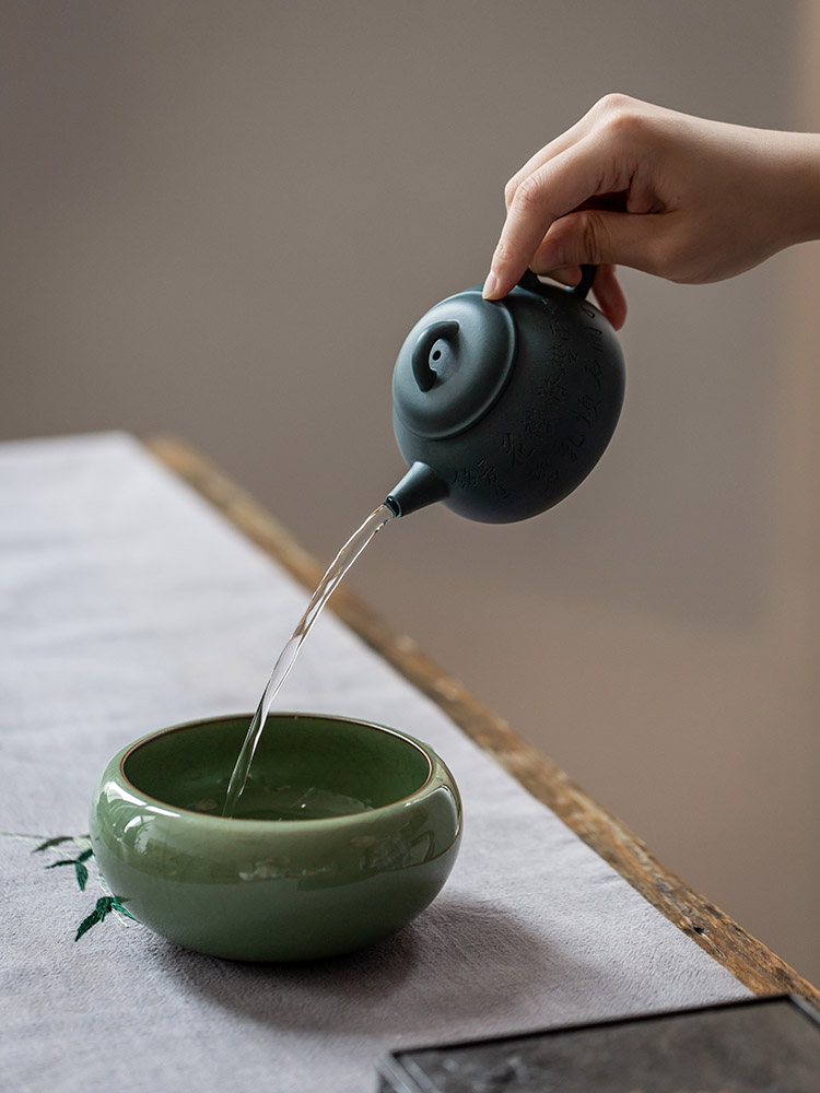 此壶的墨绿泥,色泽自然,此“绿”非我们习惯上讲的“绿”,