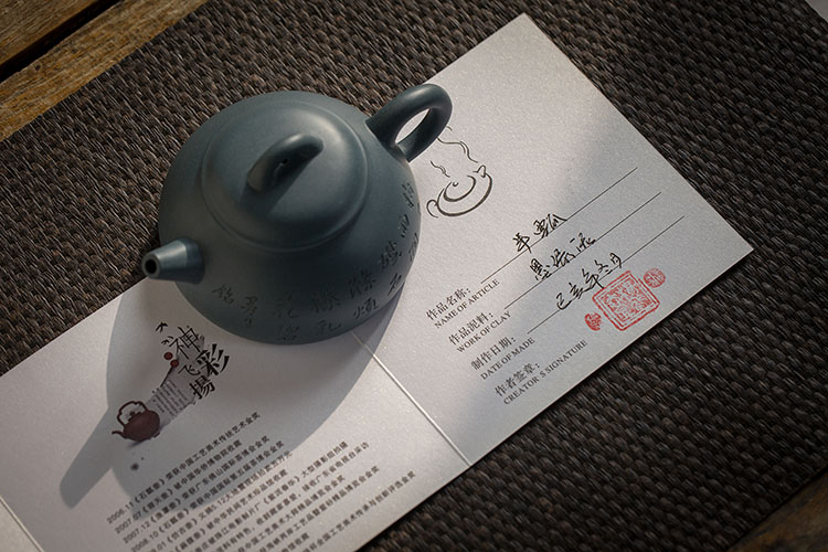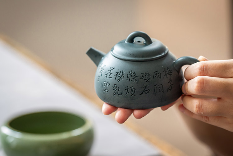 在泥料上,这款「曼生半瓢紫砂壶」选用了原矿墨绿泥为原料。