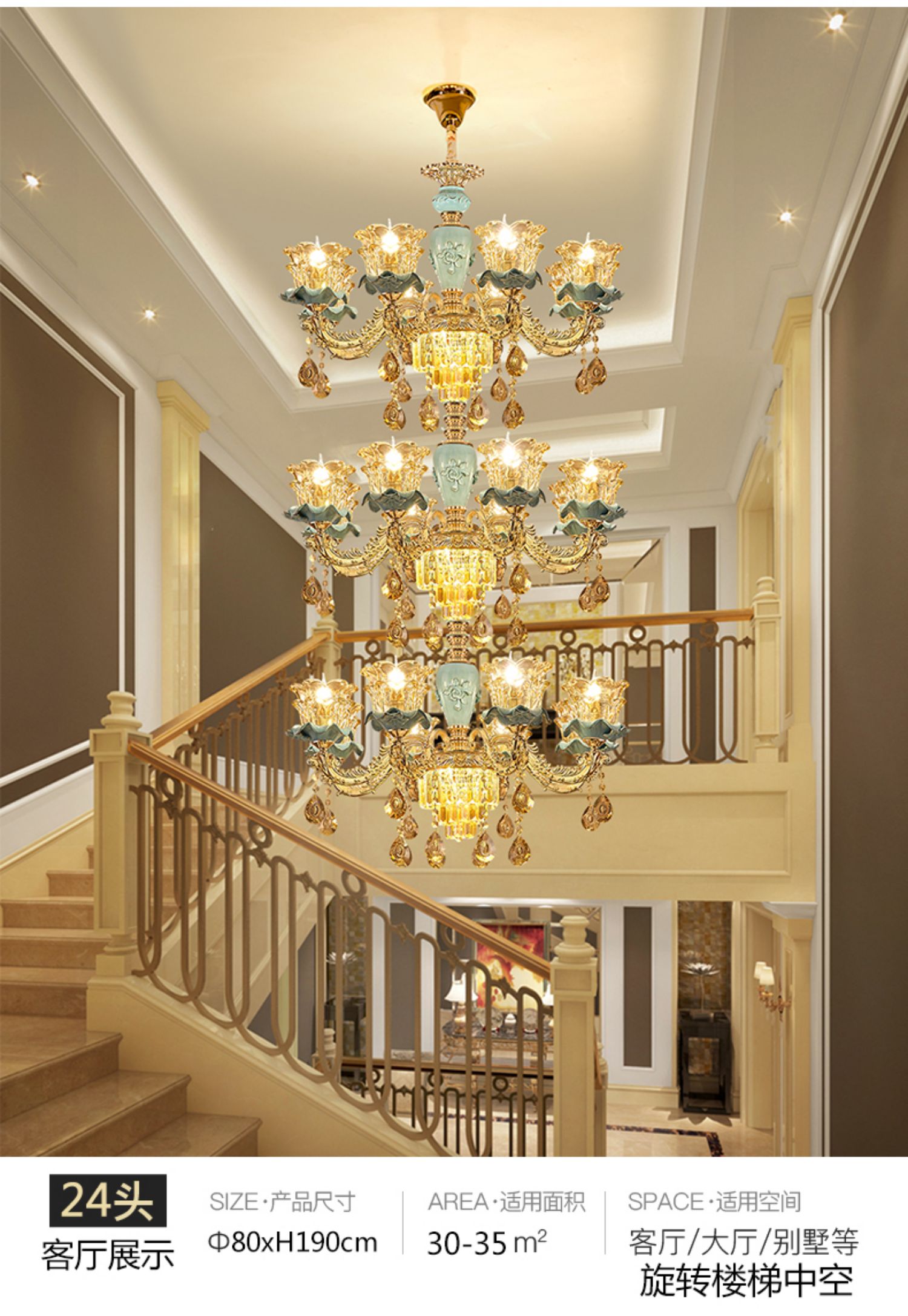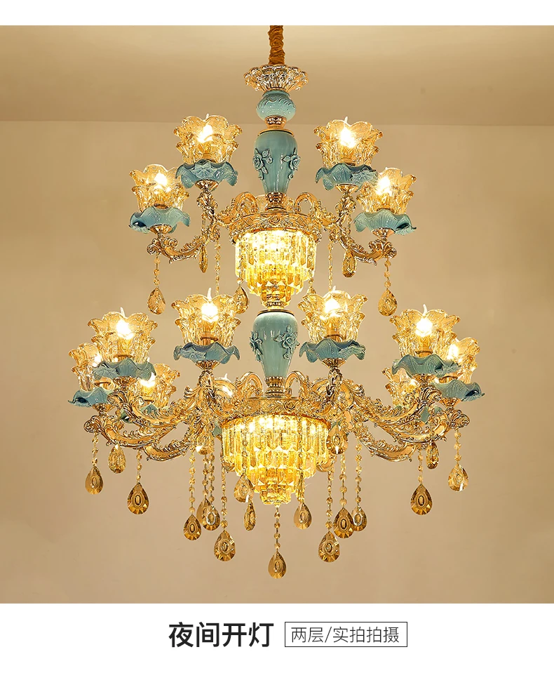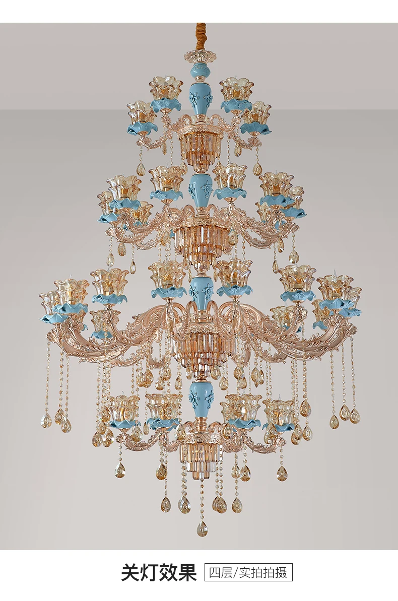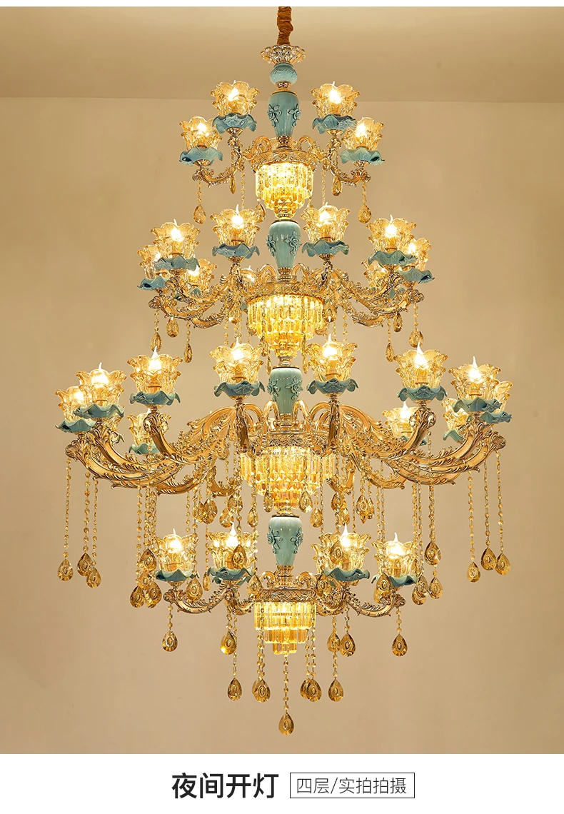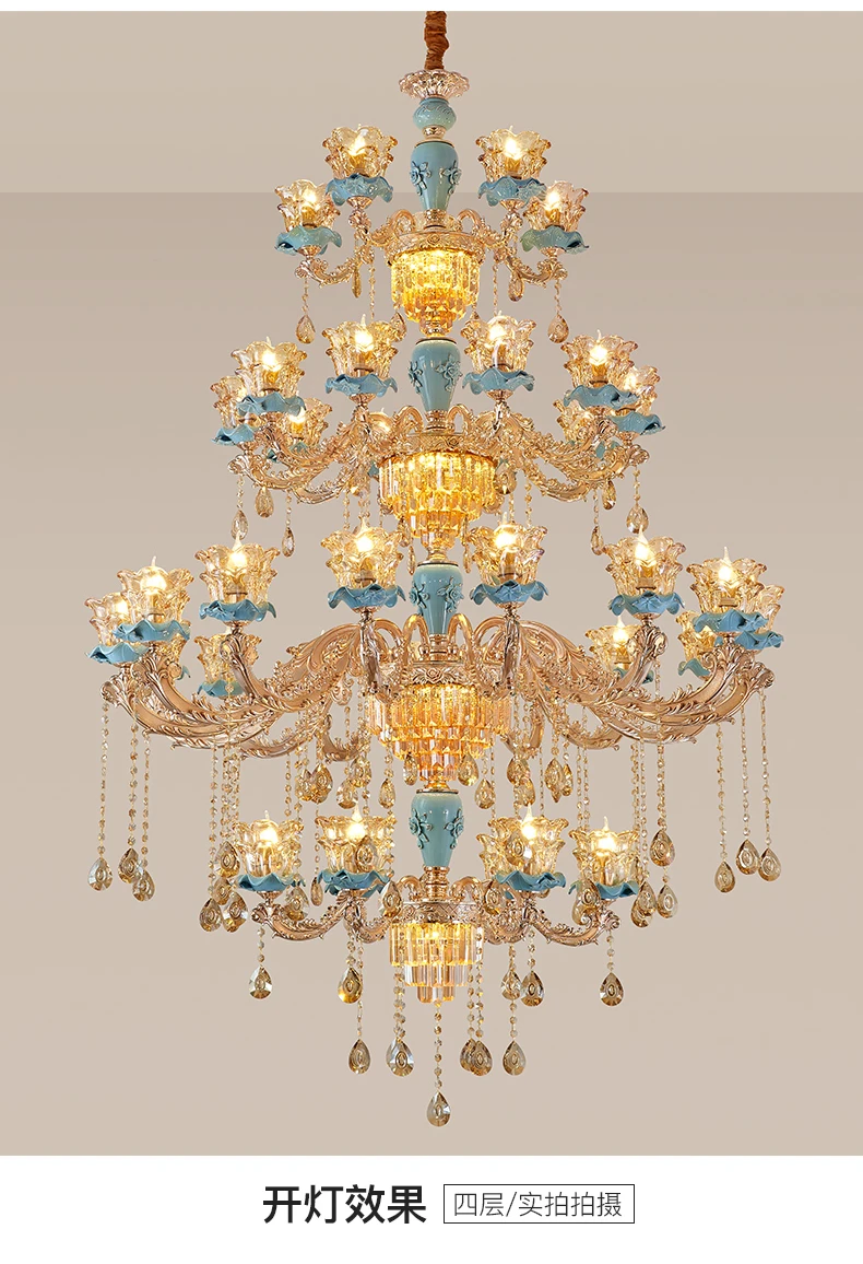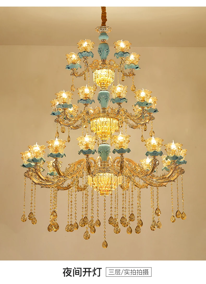 Chandelier European-Style Crystal Lamp Ceramic Three-Layer Living Room and Hotel Staircase Duplex Villa Lamps