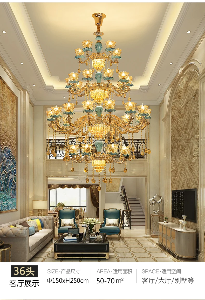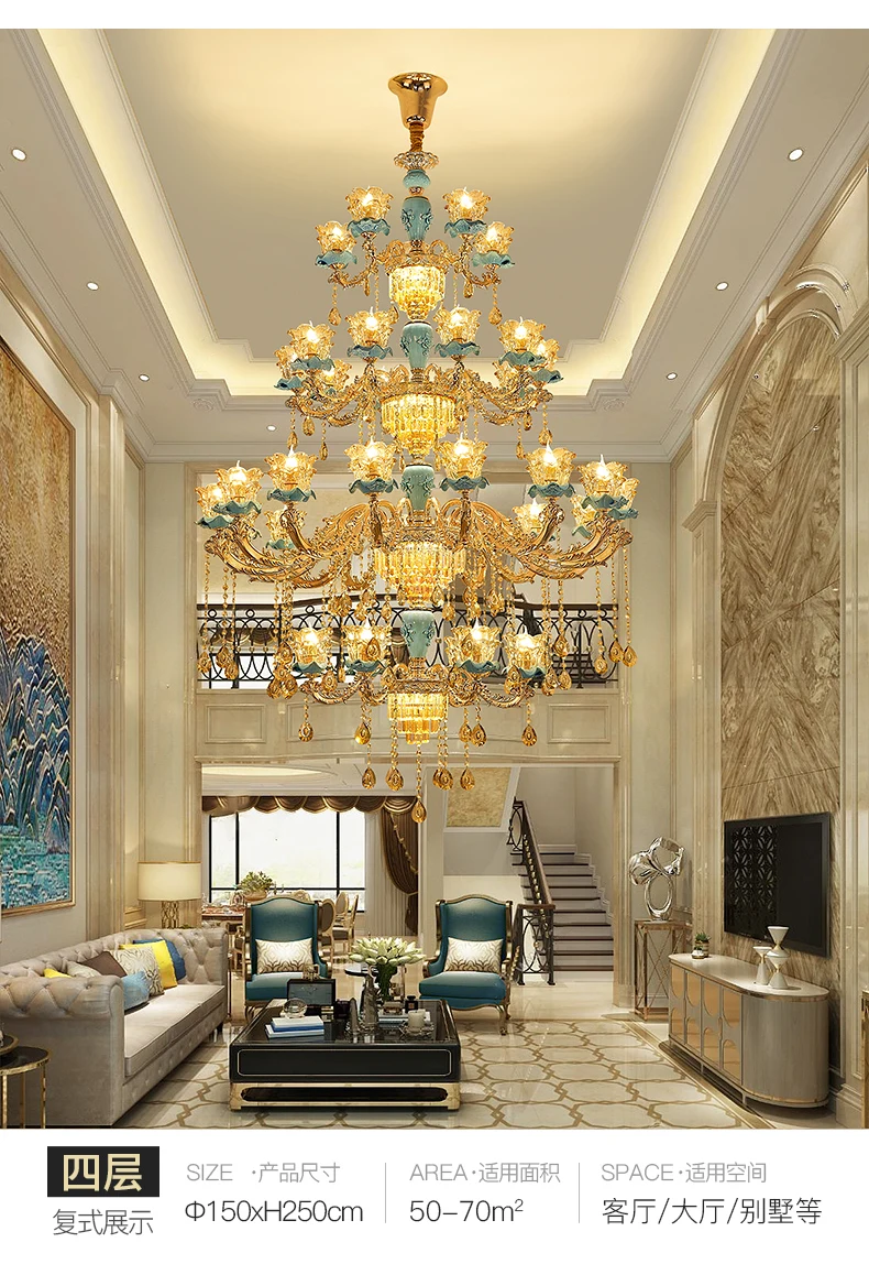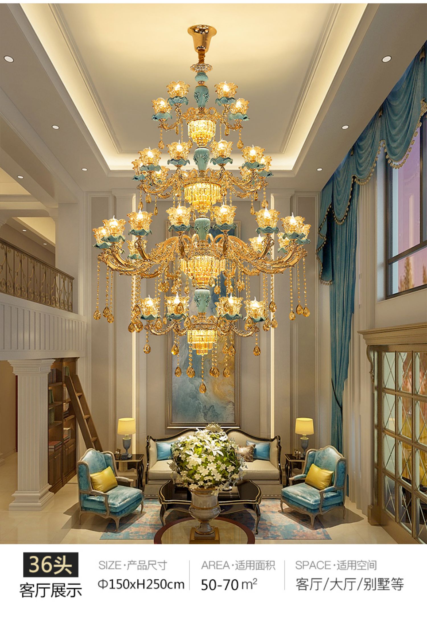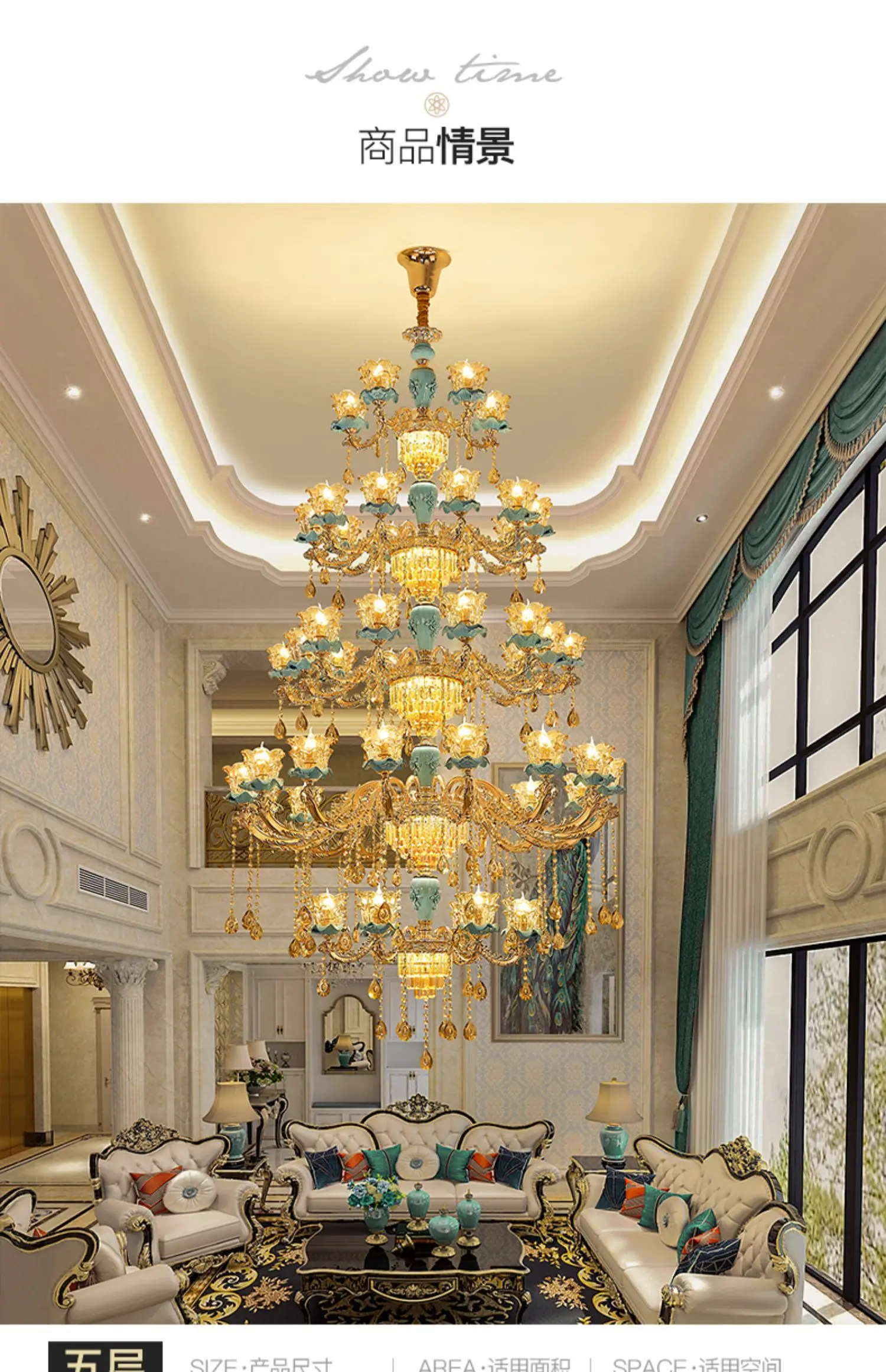 Chandelier European-Style Crystal Lamp Ceramic Three-Layer Living Room and Hotel Staircase Duplex Villa Lamps
