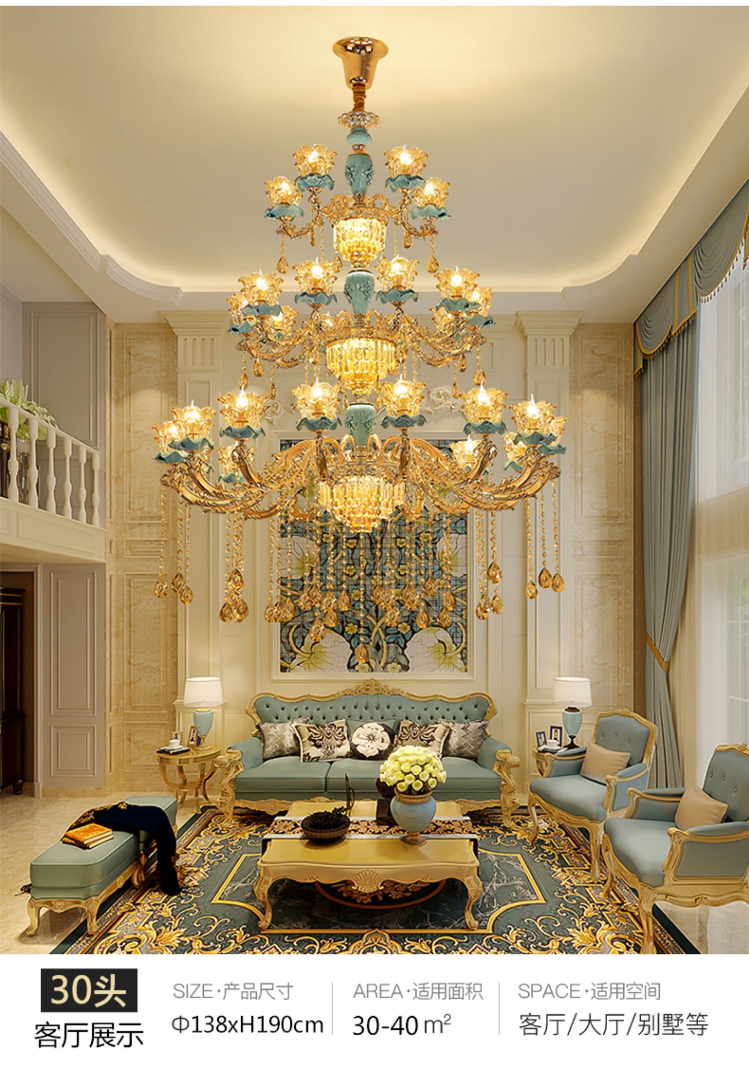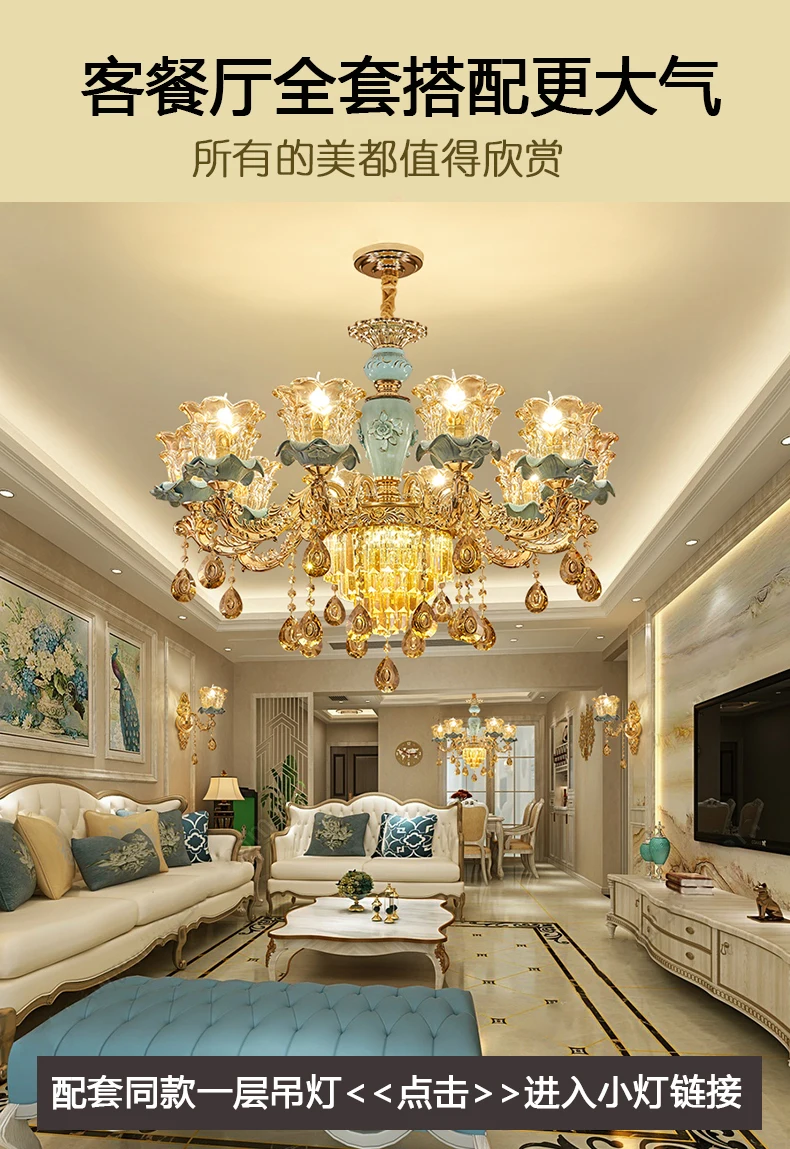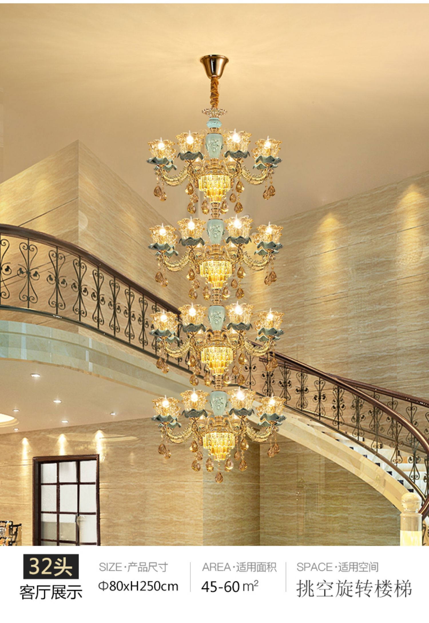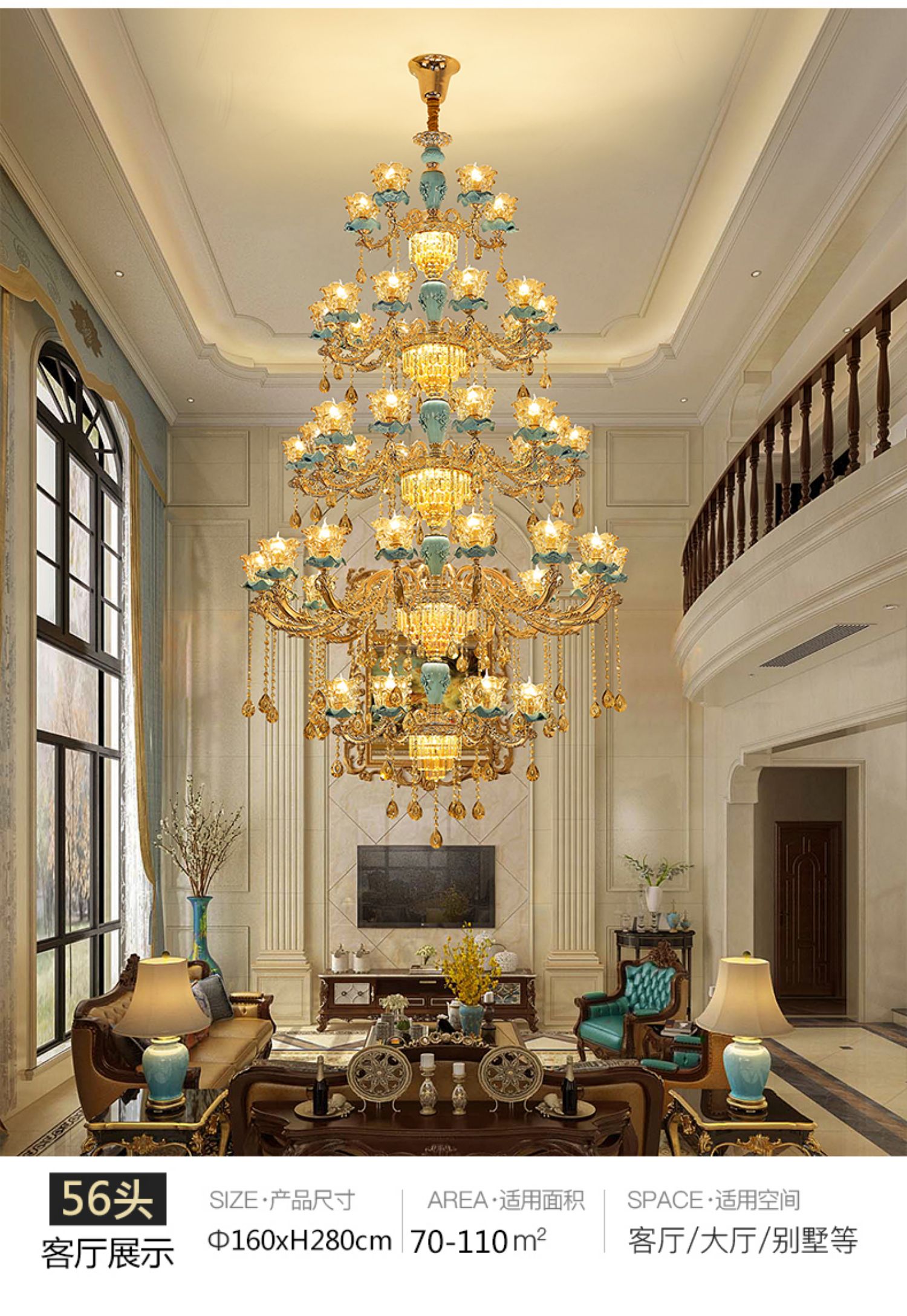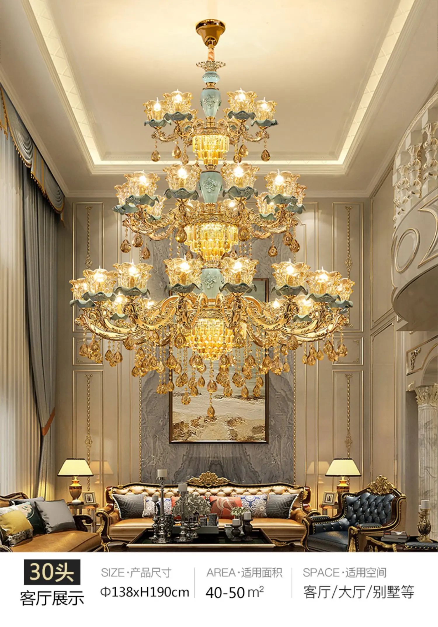 Chandelier European-Style Crystal Lamp Ceramic Three-Layer Living Room and Hotel Staircase Duplex Villa Lamps