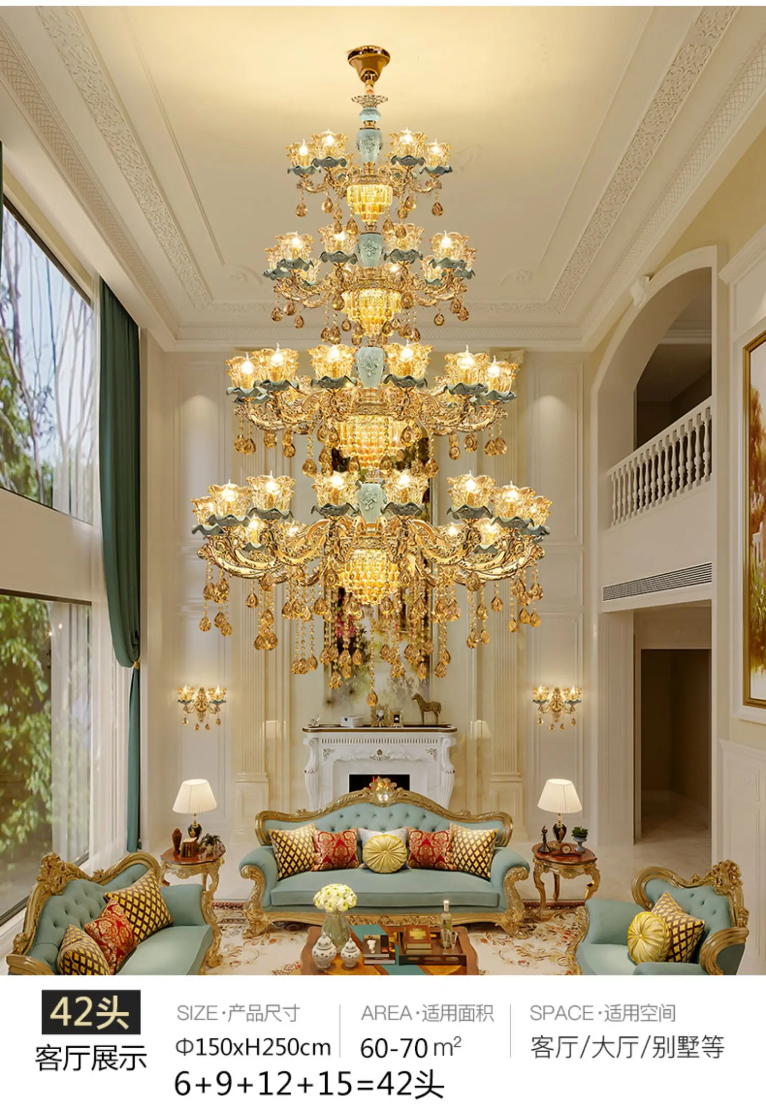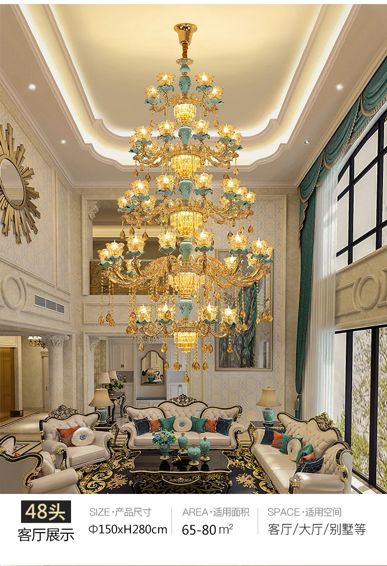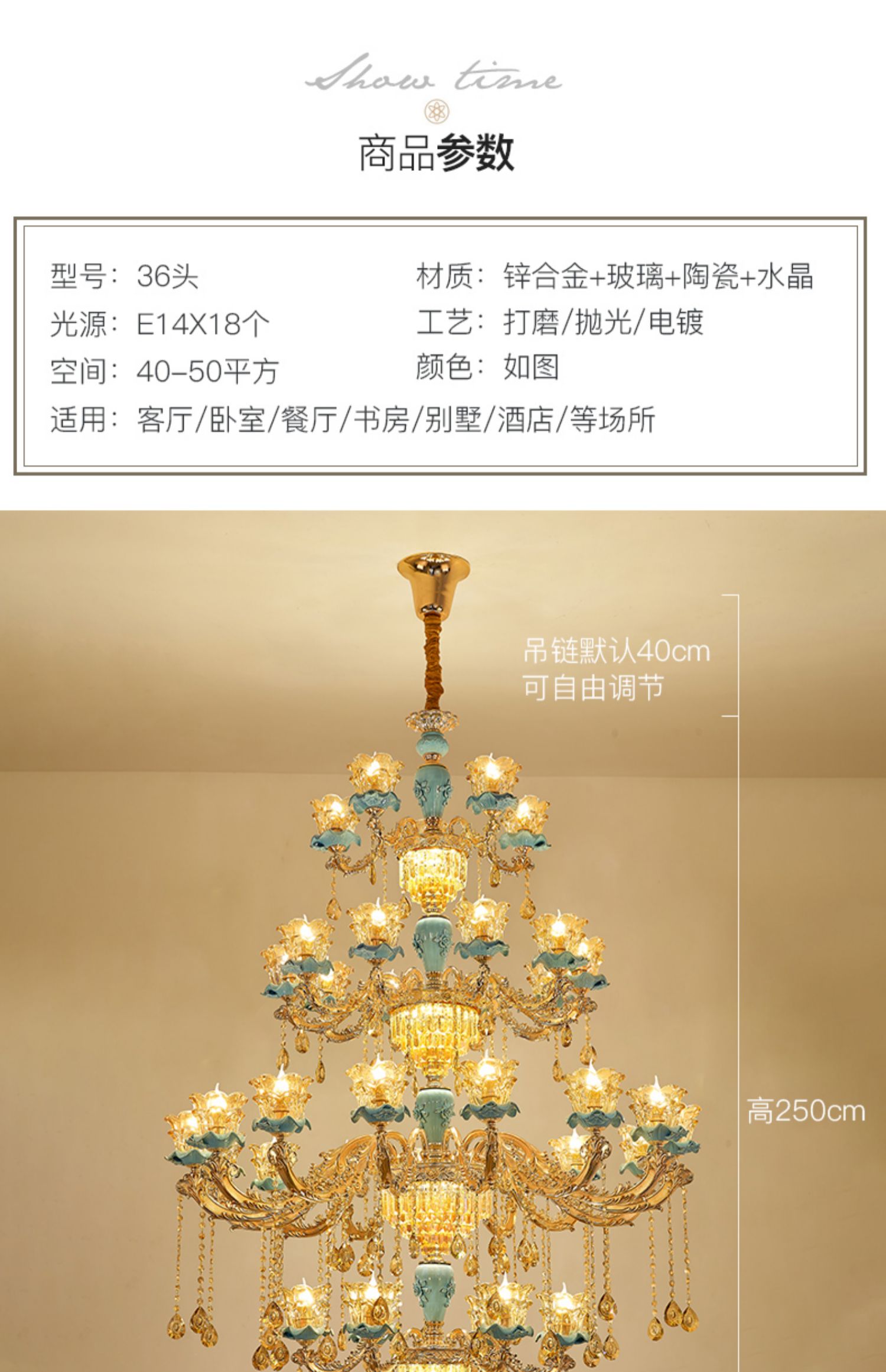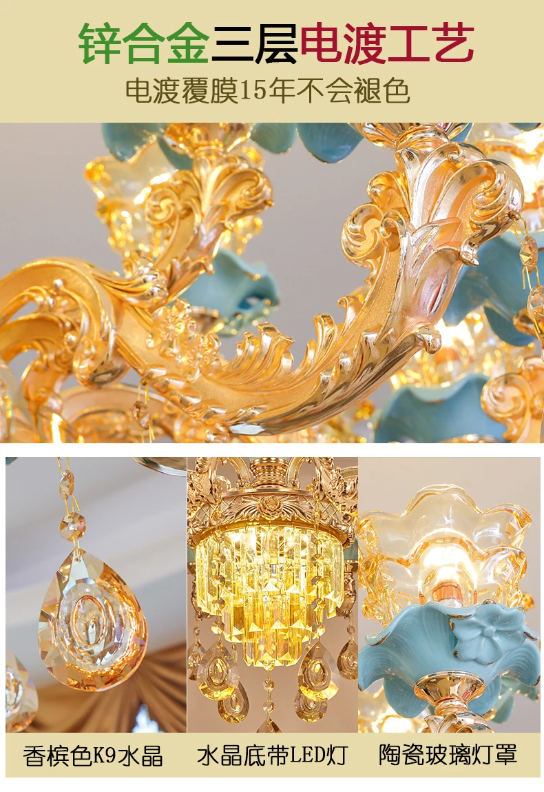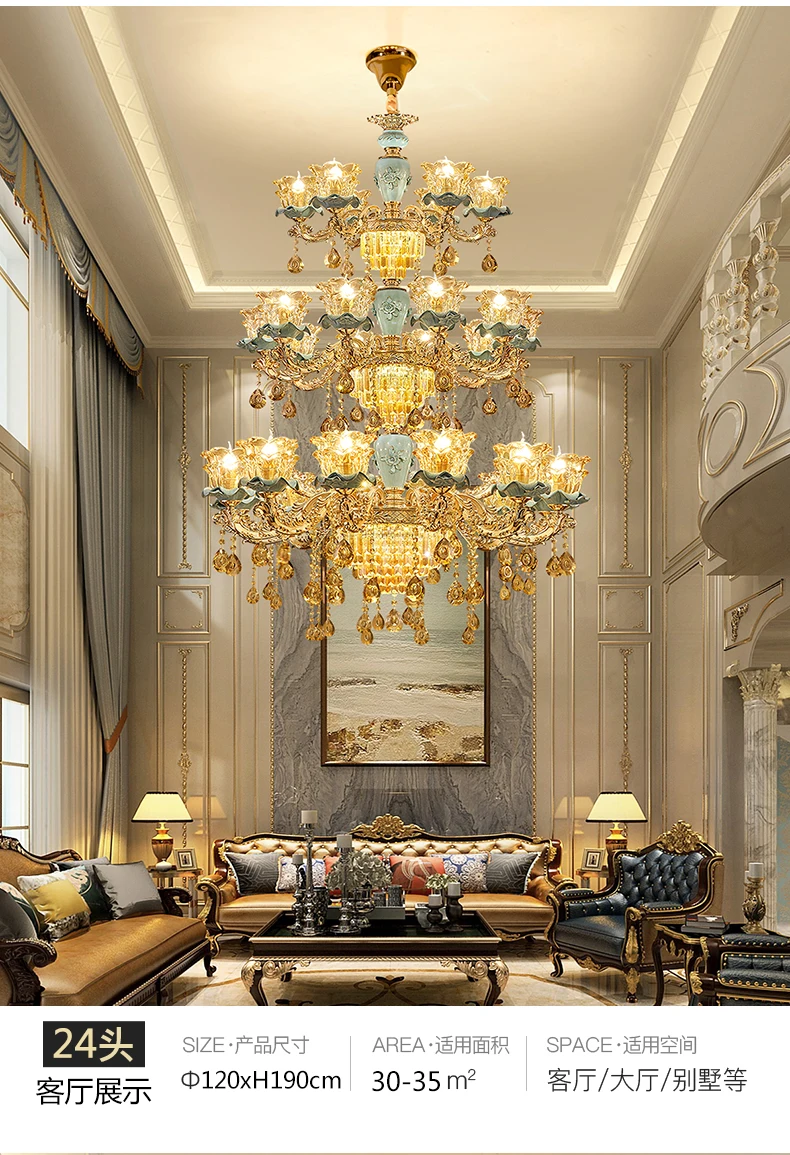 Chandelier European-Style Crystal Lamp Ceramic Three-Layer Living Room and Hotel Staircase Duplex Villa Lamps