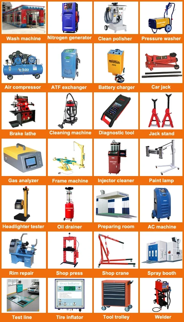 With our cooperated high quality factories, we can offer you most other garage equipments, with factory direct price! Such as washing machine, tire inflator, nitrogen generator, refrigerant recovery machine, injector cleaner, car jack, shop press, diagnostic tool, air compressor, spray booth, battery charger, painting lamp, brake lathe, test line, welder......