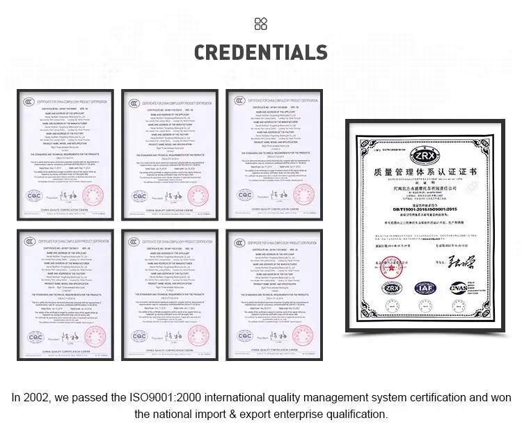 HENAN NORTHERN YONGSHENG MOTORCYCLE CO.,LTD Established in 1995, Over 25 years'development,our company has developed into a large enterprise specializing in development and research, design, sales, service, export of gasoline tricycle and electric tricycle . - our company has invested USD 15,000,000 in stage II and III of modern plant and R&D building with the cover of 110,000 square meters and building area of more than 90,000 square meters since 2005. the main products include gasoline tricycle and electric tricycle, tricycle for the aged and for the disabled, semi-enclosed tricycle, full closed tricycle and motor tricycle for special purpose with the annual designed output capacity of 300,000 tricycles. With its high quality and low energy consumption, our tricycles are very popular in overseas markets, such as India, Brazil, Indonesia, Thailand, Malaysia, Philippine, Burma, Ghana, etc.- ISO9001: 2000 international quality management system certificate- CCC( China Compulsion Certification)- import and export licence