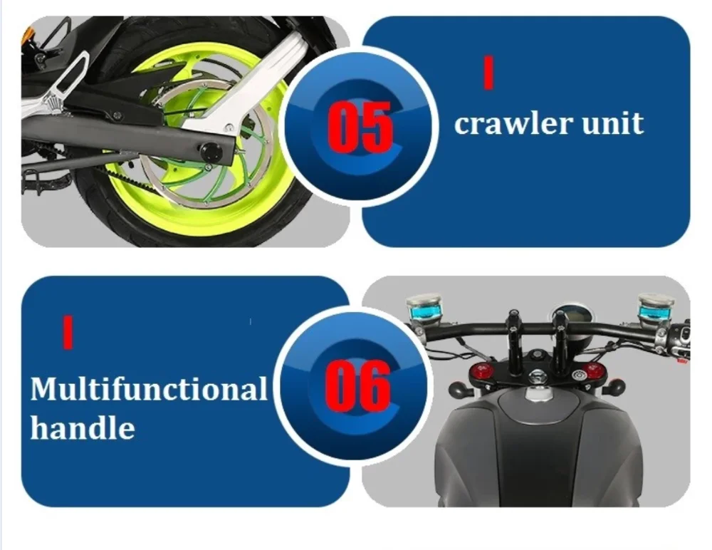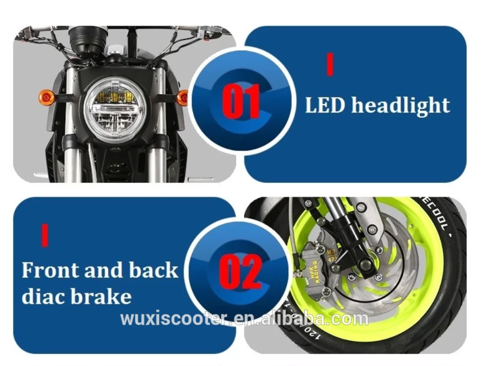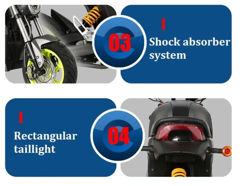 | MAX SPEED:100KM/H | FULL CHARGE DISTANCE:50-90KM | BRAKE:F&R: DISC | SLOPE:21° | FRAME:HIGH-TENSILE STEEL |