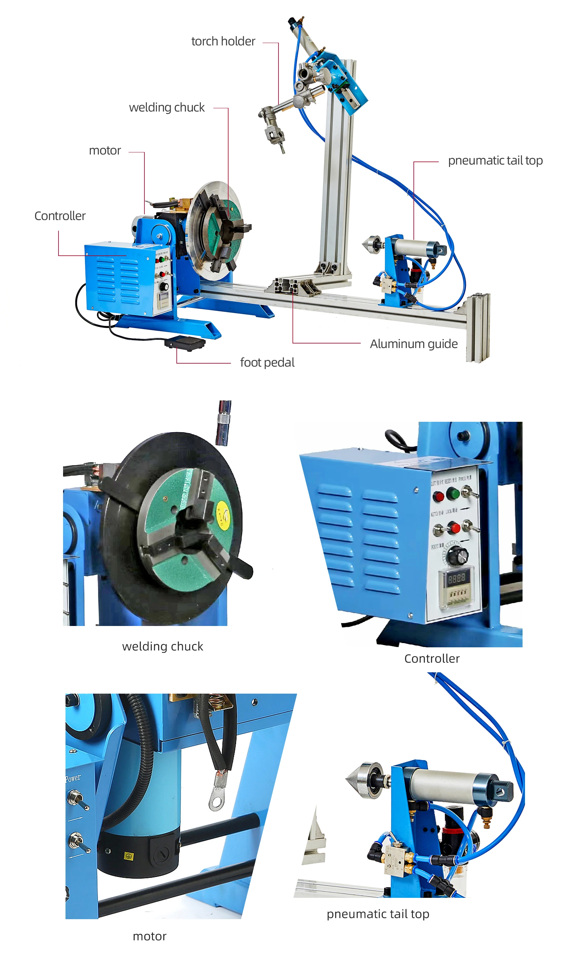 The worktable has a center through hole, long work can be directly through the hole, welding is convenient and quick