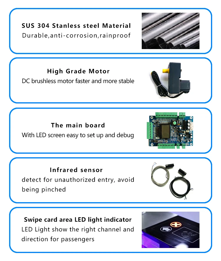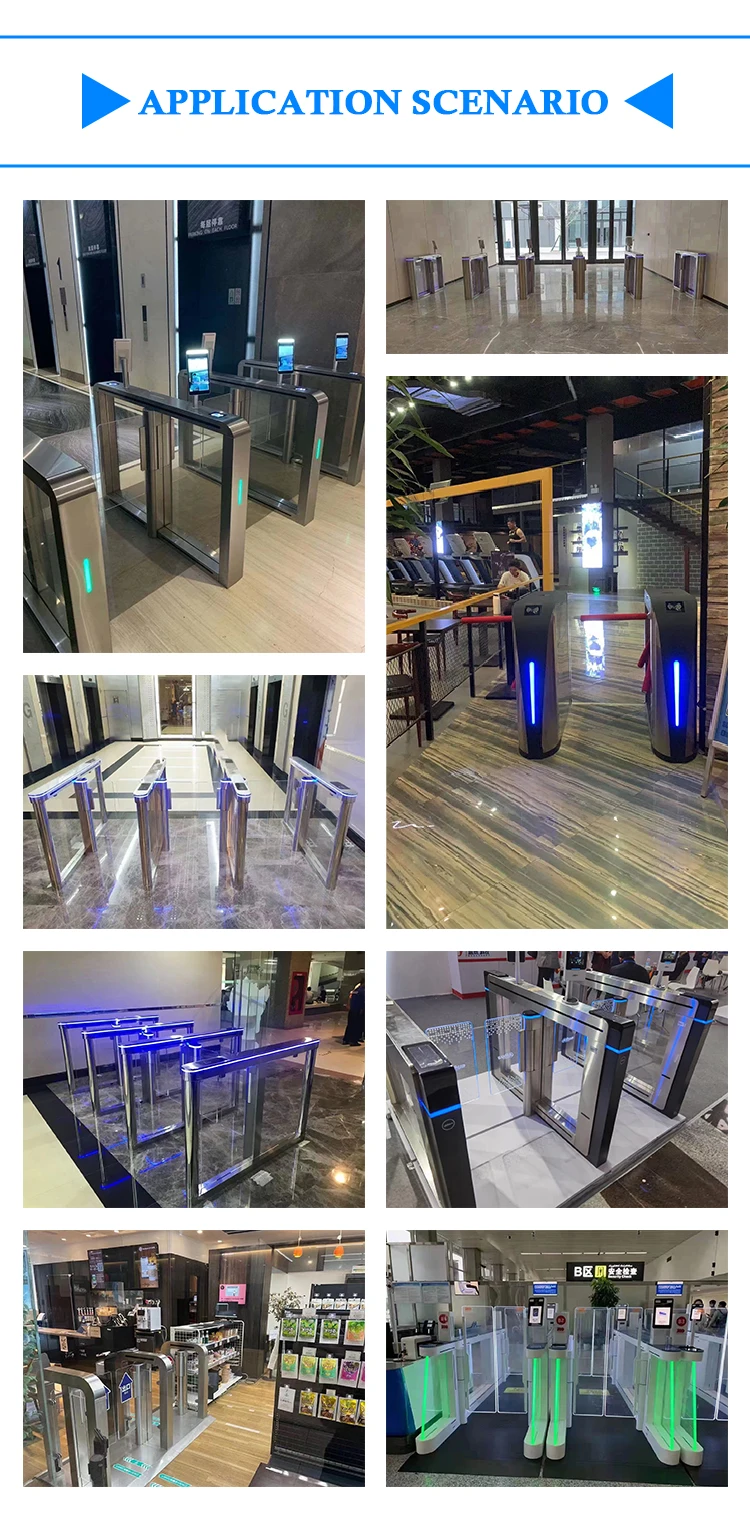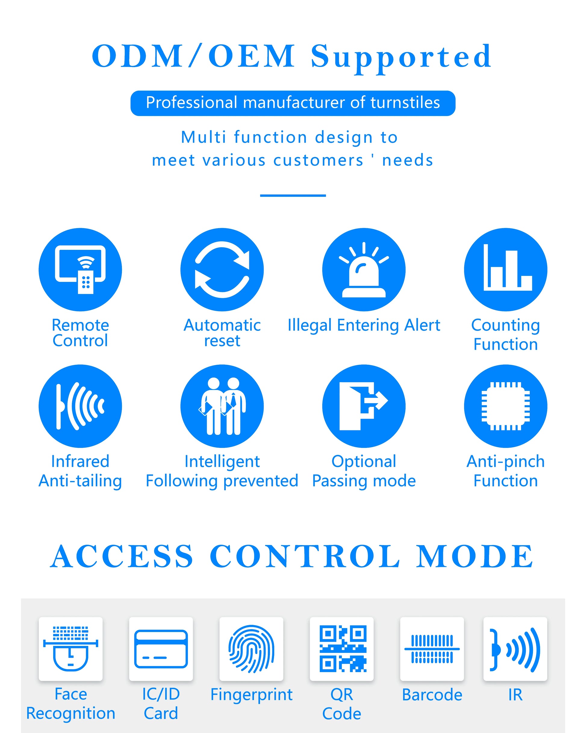 Main Function Optional card reader: Rfid card ,fingerprint scanner ,face machine ,Bar code, QR code ,card collection ,intercom system ,remote control and so on. Access control system ,Ticketing system ,consumption system Standard/customize housing design (ODM/OEM) Optional entrance width(500-1000mm) ,glass door size, operation speed