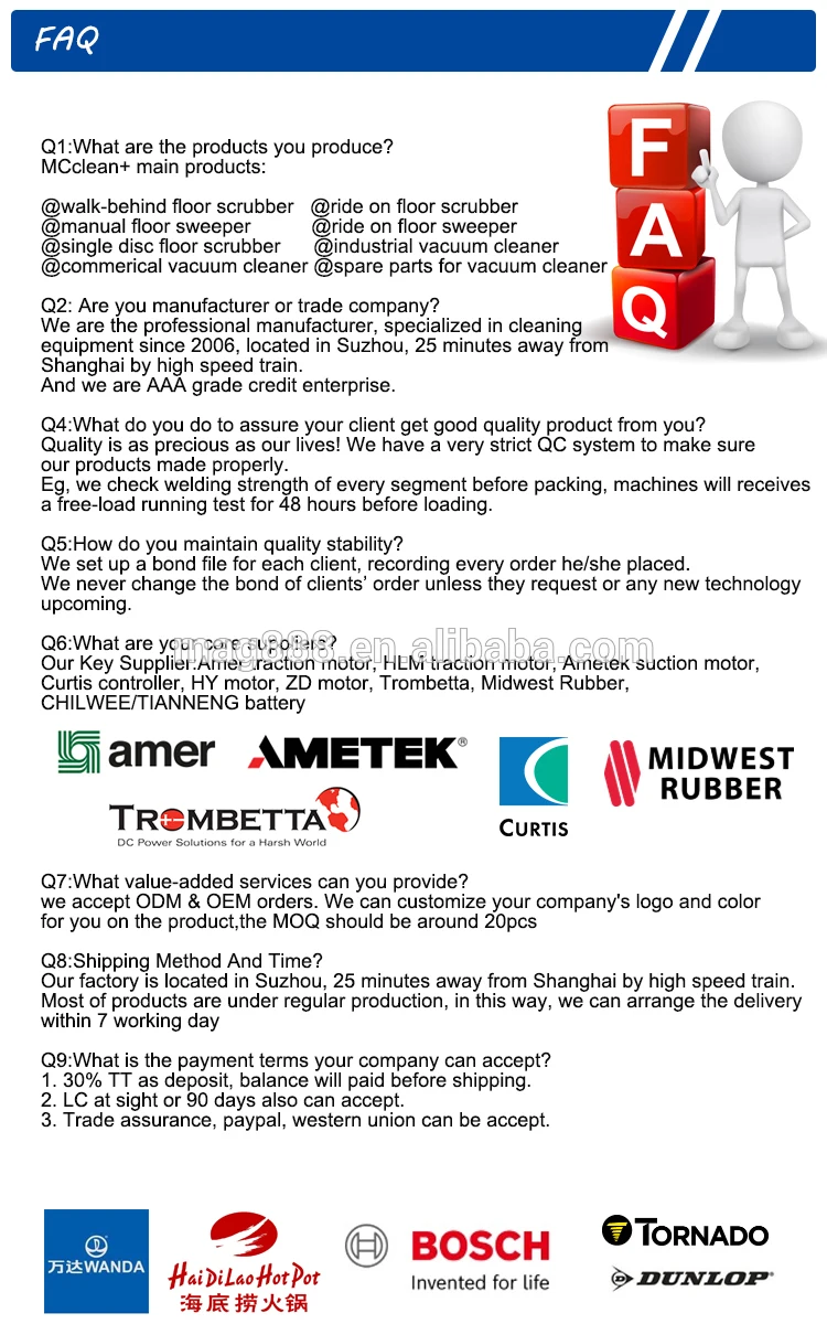Magnificent Cleaning Equipment Co., Ltd. is one of the professional manufacturers of industrial and commercial cleaning machines in China. Our factory is located in Suzhou, near Shanghai City. Our team started to design and produce floor scrubber dryers in 2005. We are established as the leader in designing and producing cleaning machines by our own in China. Our main products includes floor scrubber dryers, burnishers, polishers, carpet extractors, vacuum cleaners, and cleaning tools, such as weeper and pick up, mop, microfiber cloth. At present, more than 60% of our products are exported to Europe, Northern America, Middle-east and Southern Asia, Australia. And we also introduce the good products to our domestic market, in this way, we provide the perfect product line for our customers.