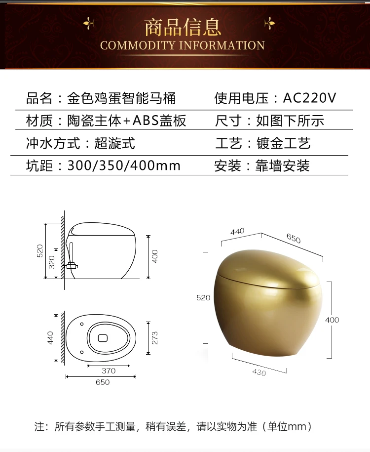 Creative European-style golden egg-shaped instant hot household toilet remote control fully automatic one-piece color smart toil