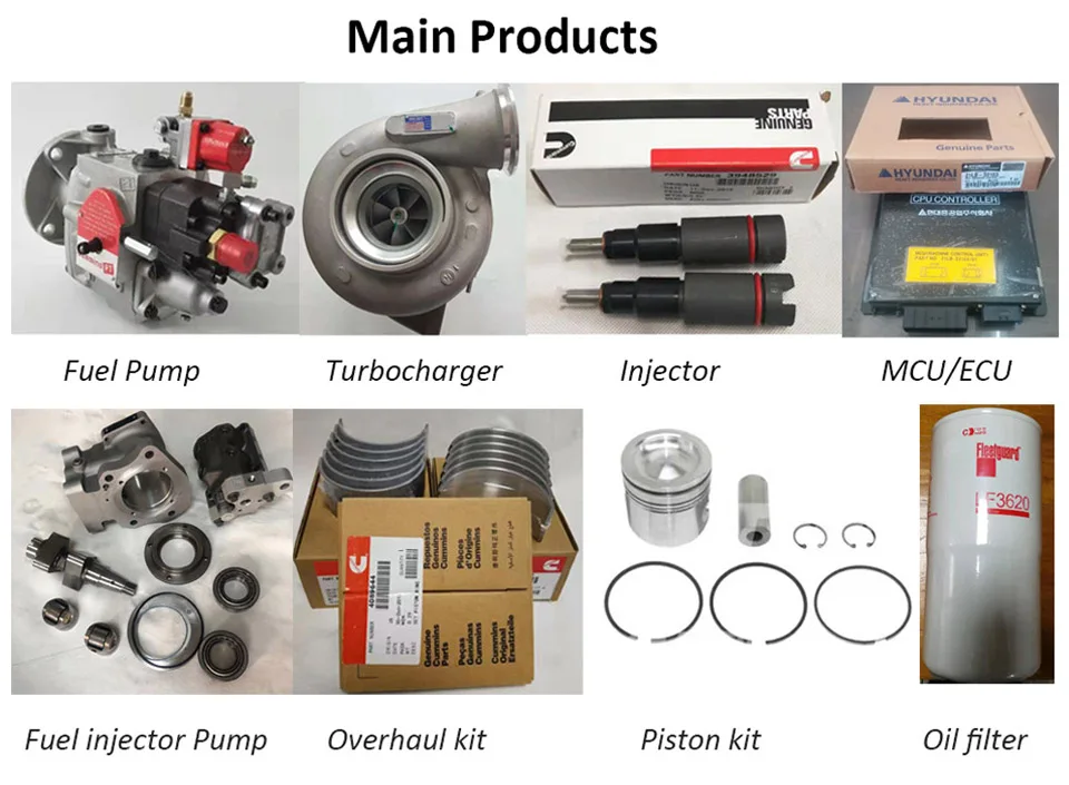 Wuhan Huacumda Machinery Co., Ltd is a Professional engine spare parts supplier for truck, marine, construction machinery, power generation equipment.Piston, Piston Ring, Piston kit, Turbocharger, Fuel Pump, Oil pump, Water Pump, Cylinder liner, Cylinder head, Cylinder head, Rocker Arm, Fuel injector, Sensor, Gasket, ECM, Crankshaft, Camshaft, Engine connecting, Tensioner belt, Connecting Rod, Intake Valve, Starter Motor, Alternator, Filter...Available Our main products include : 1. B, C, L, QSB, QSL9, QSM11, QSZ13, X15, NTA855, M11, K19, K38, K50 Engine Spare Parts. 2. C320D, C7, C9, C11, C13, C15 Engine Spare Parts. 3. 4D95, 6D102, 6D107, 6D114, 6D125, 6D140 Engine Spare Parts. 4. D6D, D6E, D7D, D7E, D11, D13 Engine Spare Parts. 5. 4TNE84, 4TNE94, 4TNE88, 4TNE98 Engine Spare Parts. 6. R215LC-7, R225LC-7, R275LC-7, R305LC-7, R335LC-7, R385LC-7, R495LC-7 Engine Spare Parts. Global Market:
