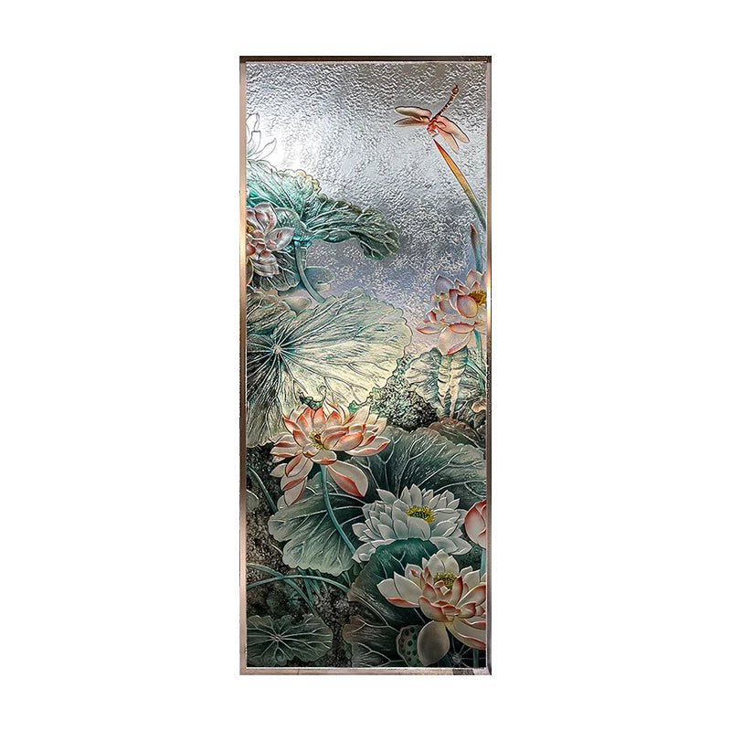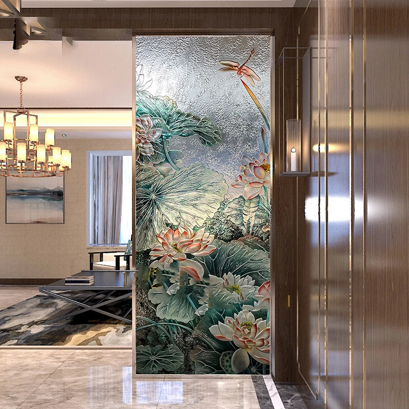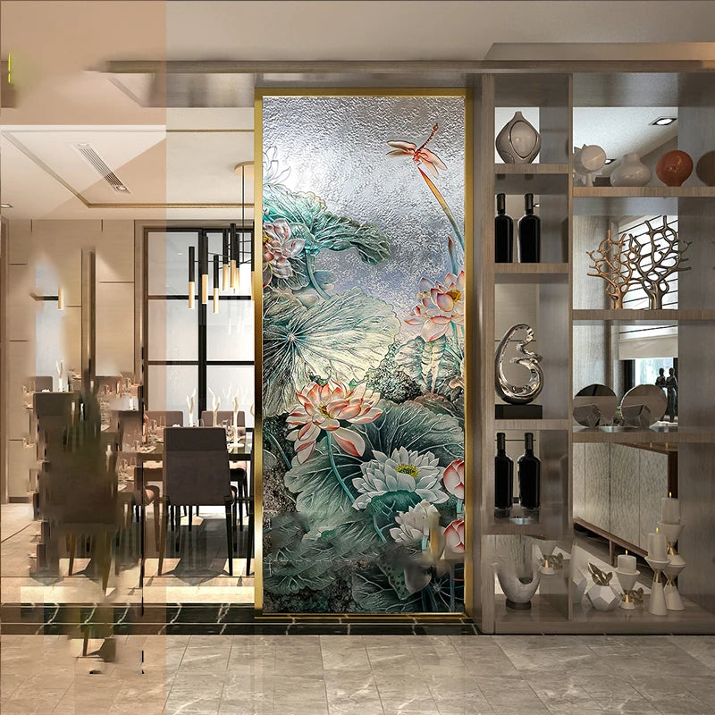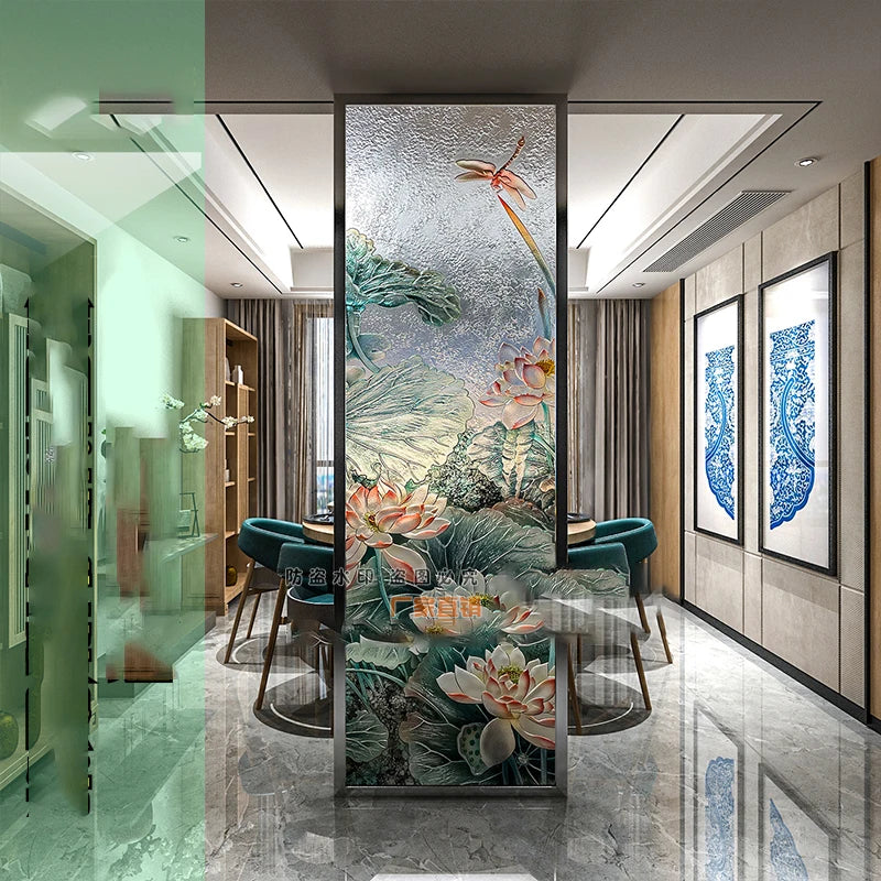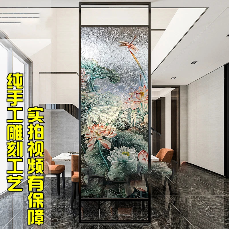 Custom Nordic light luxury transparent tempered double-sided carved stained glass partition screen home porch partition wall