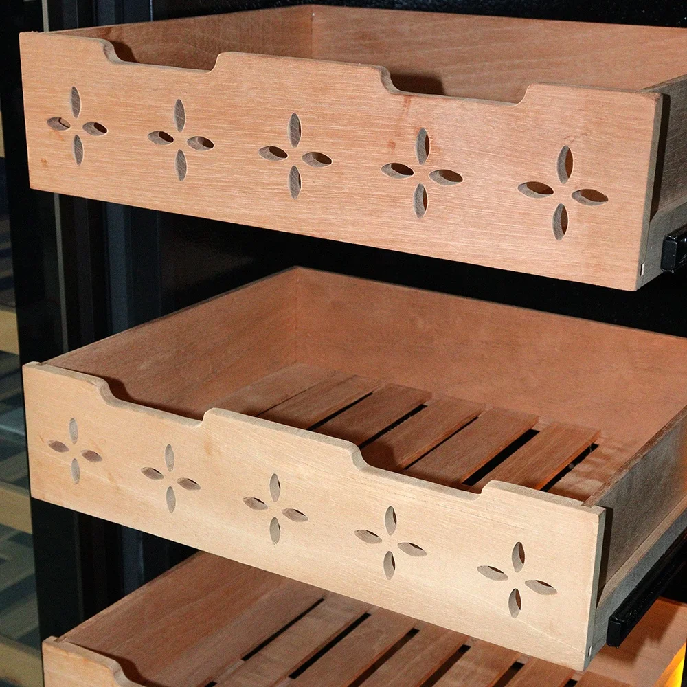 Volume: 800 Liter, dual temperature zone Storage capacity: around 2200 cigars Installation: Free standing Shelf configuration: 14 cedar shelves Adjustable temperature range: 15 to 25 ℃ (59 to 77°F) Adjustable humidity range: 60%-80%