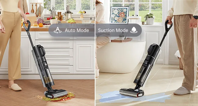 Two cleaning modes to choose. Handle dirt and spills with auto mode, or switch to suction mode to quickly clean wet floors in the bathroom.