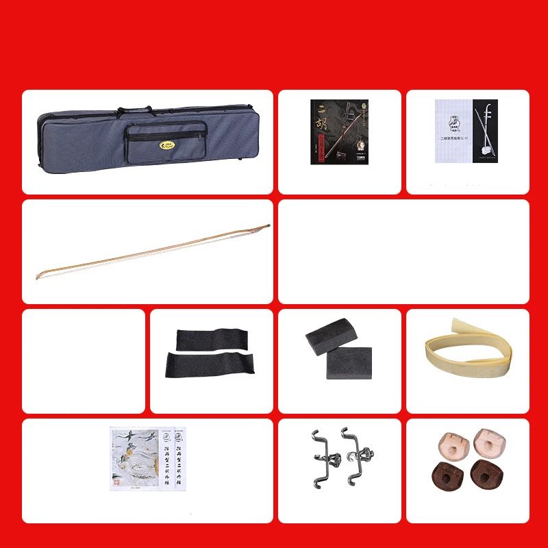 Package:Erhu*1;Bow*1, Case*1,Tuner*1;Spare strings*1;Mute*1,Mat and Bridge*1