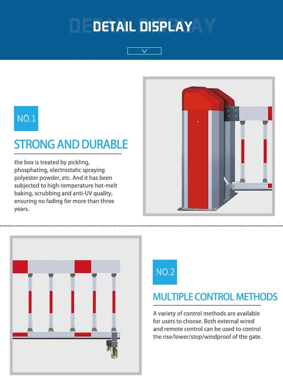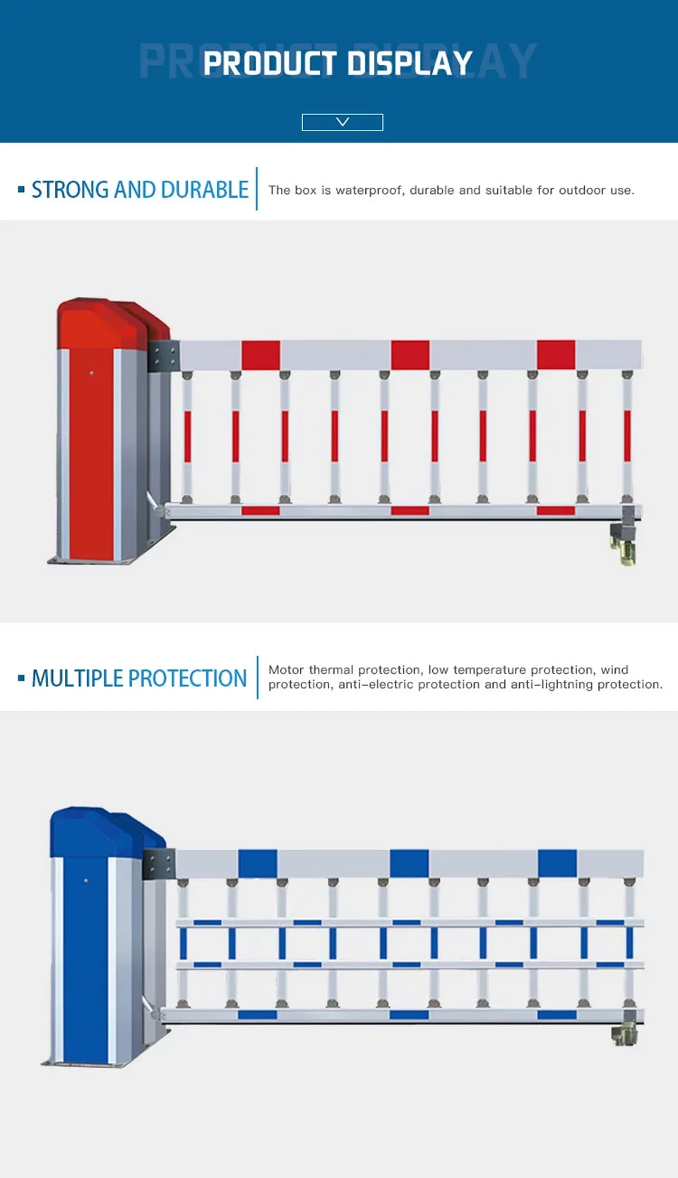 1. The box is waterproof, durable and can be used in outdoor environments. closed fence barriers prevent people from crossing casually. 2. the box is treated by pickling, phosphating, electrostatic spraying polyester powder, etc. And it has been subjected to high-temperature hot-melt baking, scrubbing and anti-UV quality, ensuring no fading for more than three years. 3. The shape is simple and grand, with a good view of the advertising light box and the flap advertising position, the flap can be separately disassembled, easy to change the screen, easy to operate. 4. This system can be equipped with soft hose to prevent crash, as well as other protective equipment such as air pressure waves, so that the system has anti-smashing functions. 5. A variety of control methods are available for users to choose. Both external wired and remote control can be used to control the rise/lower/windproof of the gate. 6. The use of multiple protection measures (heater protection, low temperature protection, wind protection, anti-electricity protection, anti-lightning protection, etc.), the reliability of the barrier operation is greatly improved. 7. Integrating light, electricity and mechanical control, flexible operation, convenient and reliable. 8. It can be used with the optional vehicle detector to make it have the functions of “automatic drop-off after the car passing” and “automatic lifting of the drop-bar when there is a car”, which make the barrier have automatic closing and perfect anti-smashing function. 9. It has the function of opening the gate priority, which can effectively improve the efficiency of the vehicle passing through the channel. 10. The system uses a standard electrical interface externally, which can be easily attached to other systems selected by the user. 11. Advertising light box and flap advertising with LED light strip, adjustable time control, or light sense control, energy saving. 12. All moving parts have been adjusted to a gentle movement and balance state, the solid machine performance is stable, the operation is smooth, the noise is small, and the service life is long.