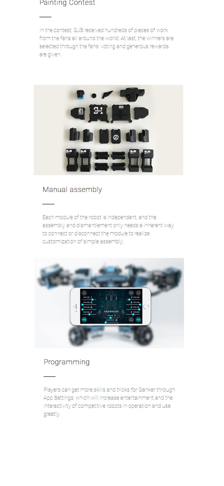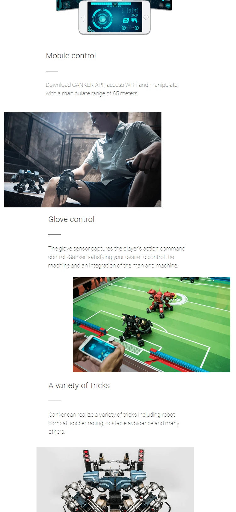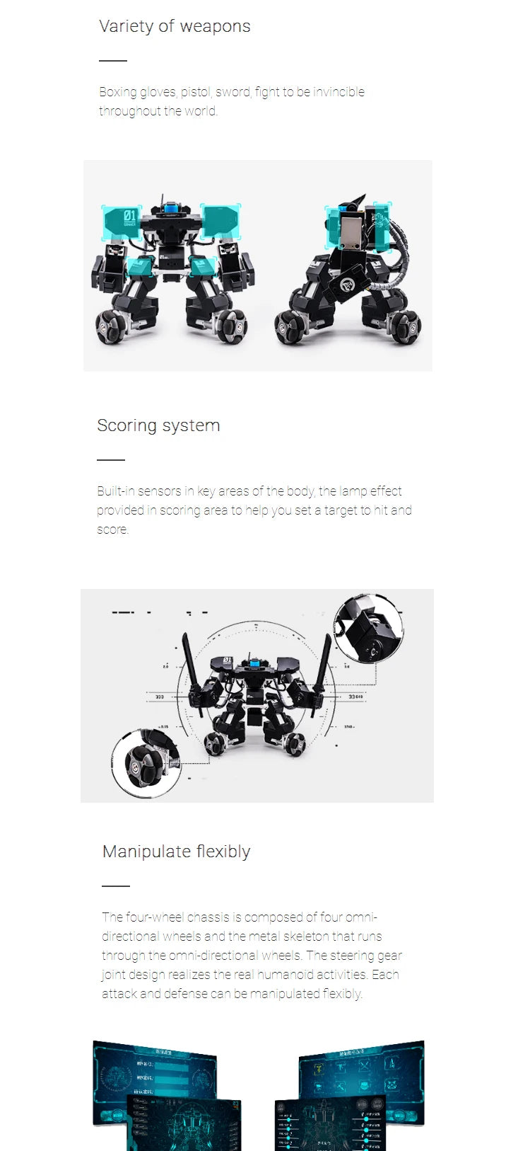 1.Face-to- face real fighting as immersive experience. Small-sized high-performance motion skeleton was used,numercial eletronic judgement system distributed all over the bady.Subvert operating of traditional toy robot.