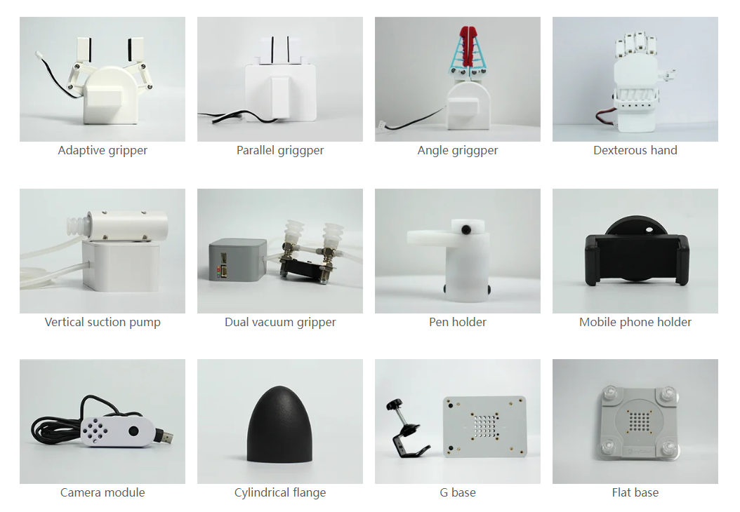 Dozens of accessories, such as adaptive grippers, camera flanges, suction pumps, etc., helping users to play to the creative ideas of myCobot.