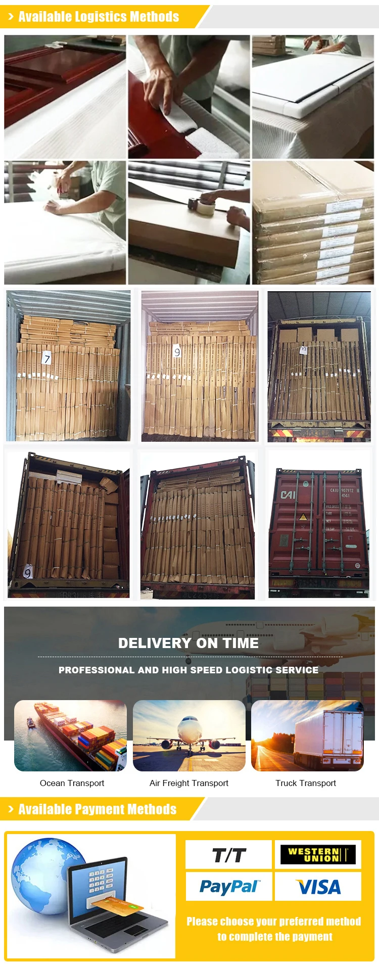We accept TT, western union, paypal, we highly recommend you TRADE ASSURANCE to guarantee the quality and shiping time.