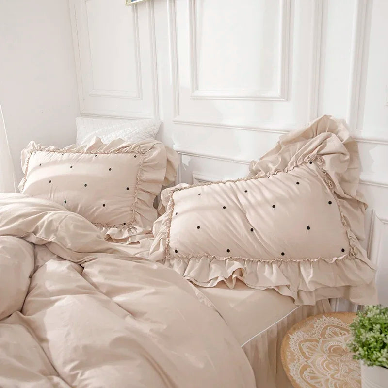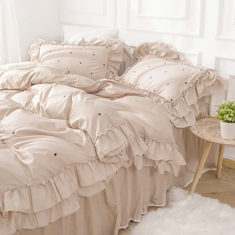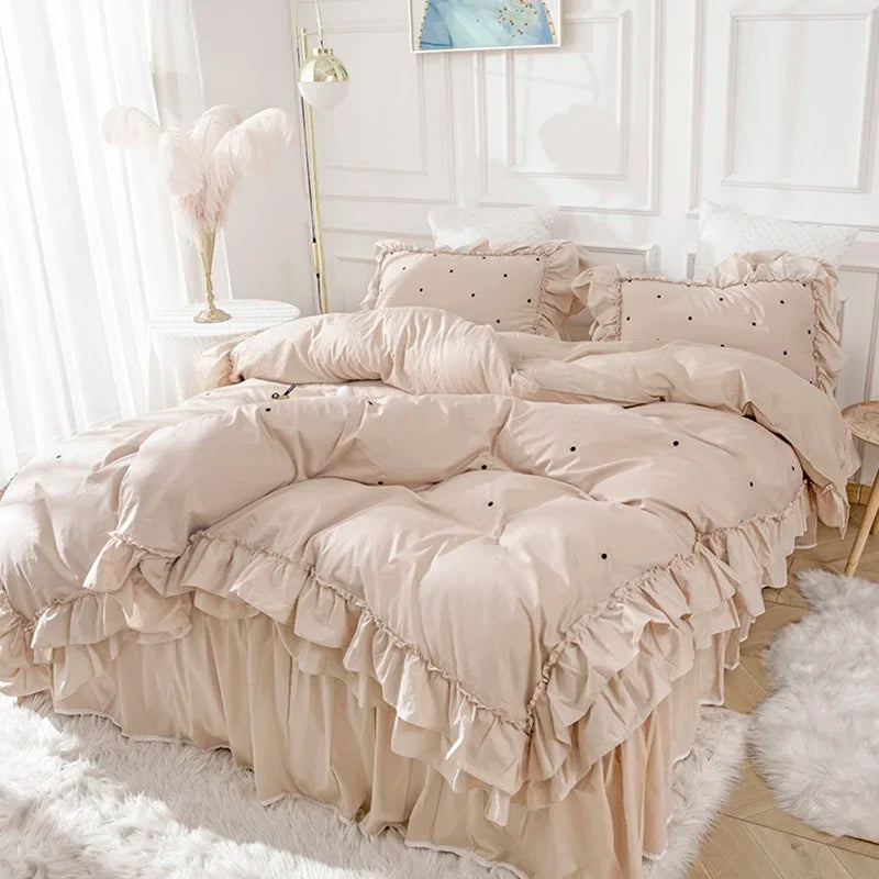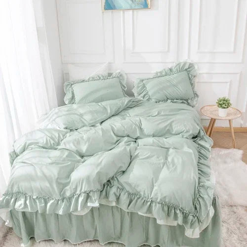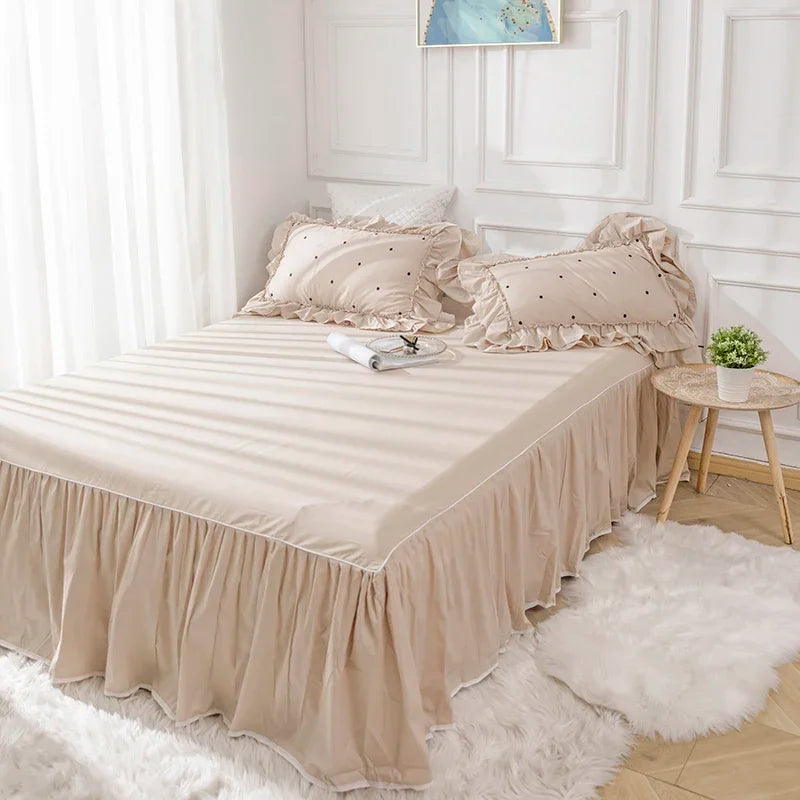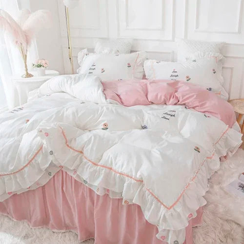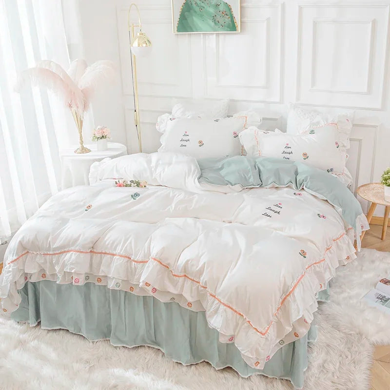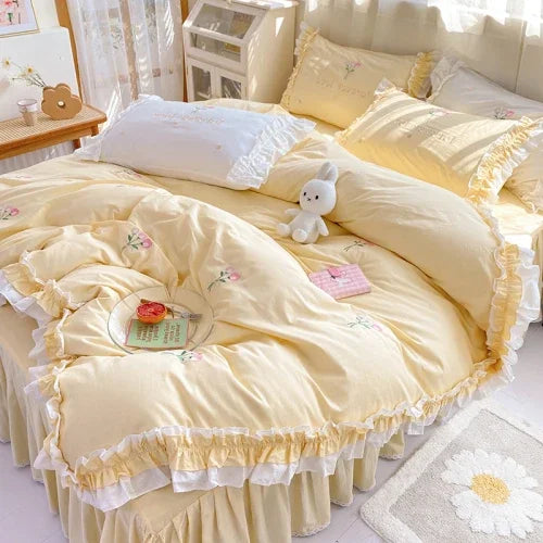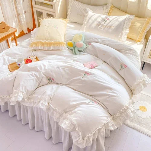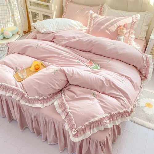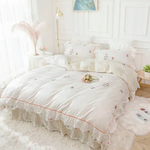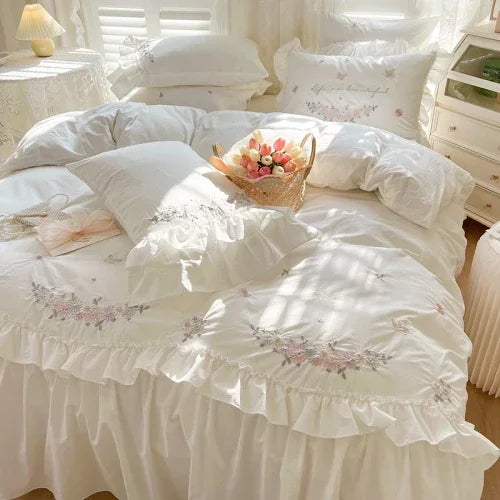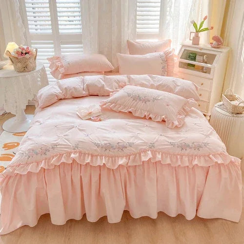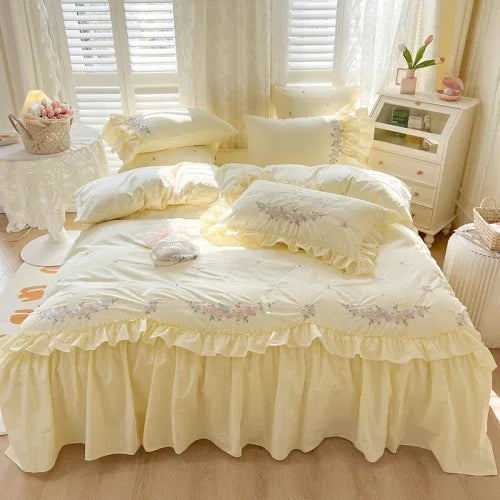 Four-Piece Set Light Luxury Flower Embroidery Cotton Home Textile Bedding Ruffled Bed Skirt Heat Preservation Solid Color 1.8M