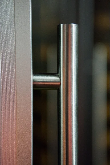 1. Elegant Design Style – Natural wood trim shelving to pair with the stainless steel door.