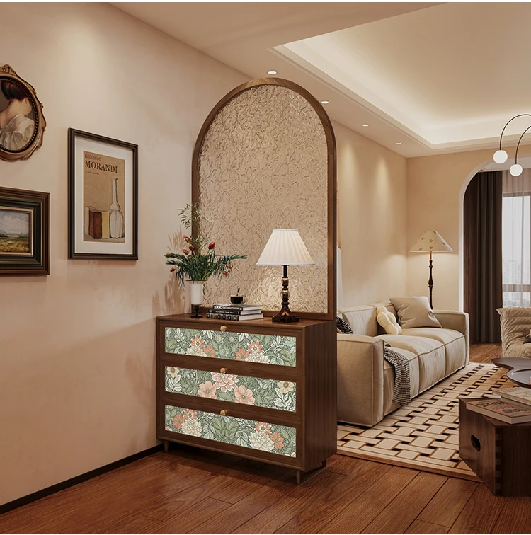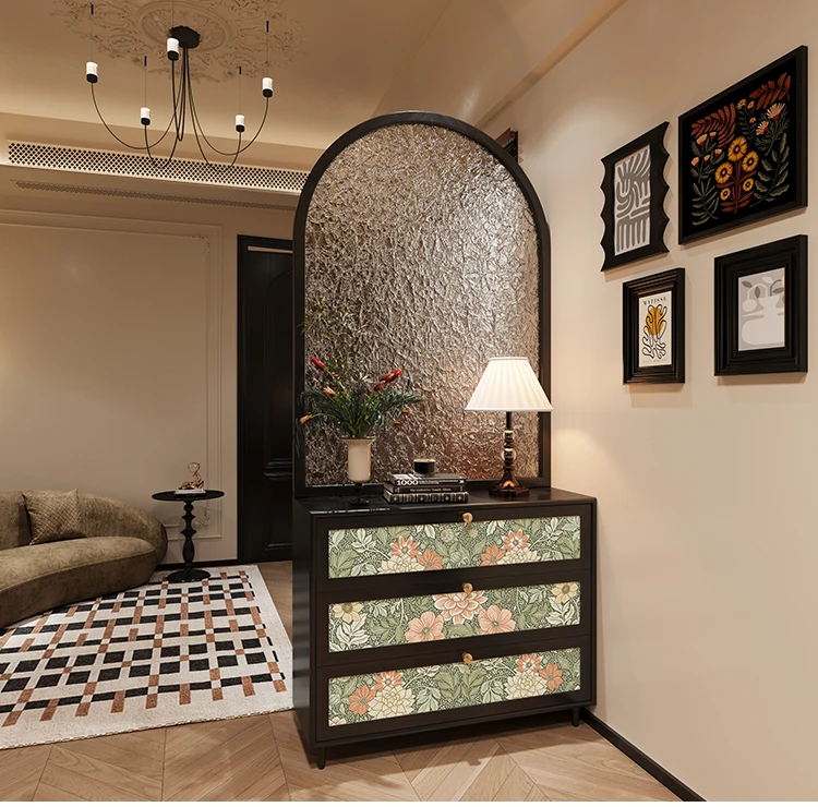 French retro cream feng shui patterned glass entrance door, solid wood screen partition, living room, shoe cabinet, foyer cabine